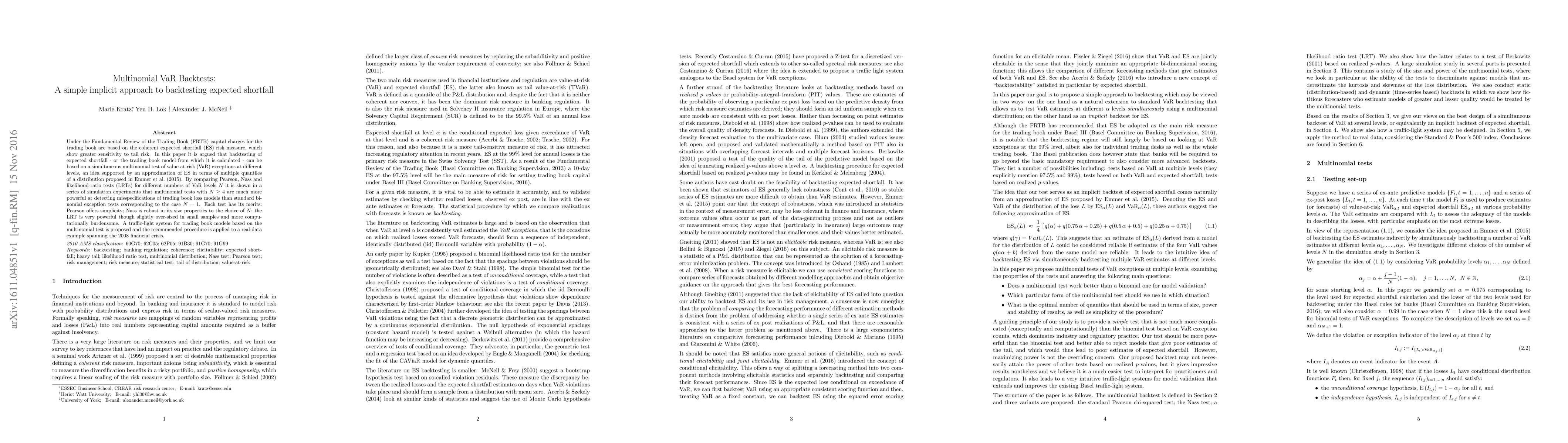 Under the Fundamental Review of the Trading Book (FRTB) capital charges for the trading book are based on the coherent expected shortfall (ES) risk measure, which show greater sensitivity to tail risk. In this paper it is argued that backtesting of expected shortfall - or the trading book model from which it is calculated - can be based on a simultaneous multinomial test of value-at-risk (VaR) exceptions at different levels, an idea supported by an approximation of ES in terms of multiple quantiles of a distribution proposed in Emmer et al. (2015). By comparing Pearson, Nass and likelihood-ratio tests (LRTs) for different numbers of VaR levels $N$ it is shown in a series of simulation experiments that multinomial tests with $N\geq 4$ are much more powerful at detecting misspecifications of trading book loss models than standard binomial exception tests corresponding to the case $N=1$. Each test has its merits: Pearson offers simplicity; Nass is robust in its size properties to the choice of $N$; the LRT is very powerful though slightly over-sized in small samples and more computationally burdensome. A traffic-light system for trading book models based on the multinomial test is proposed and the recommended procedure is applied to a real-data example spanning the 2008 financial crisis.