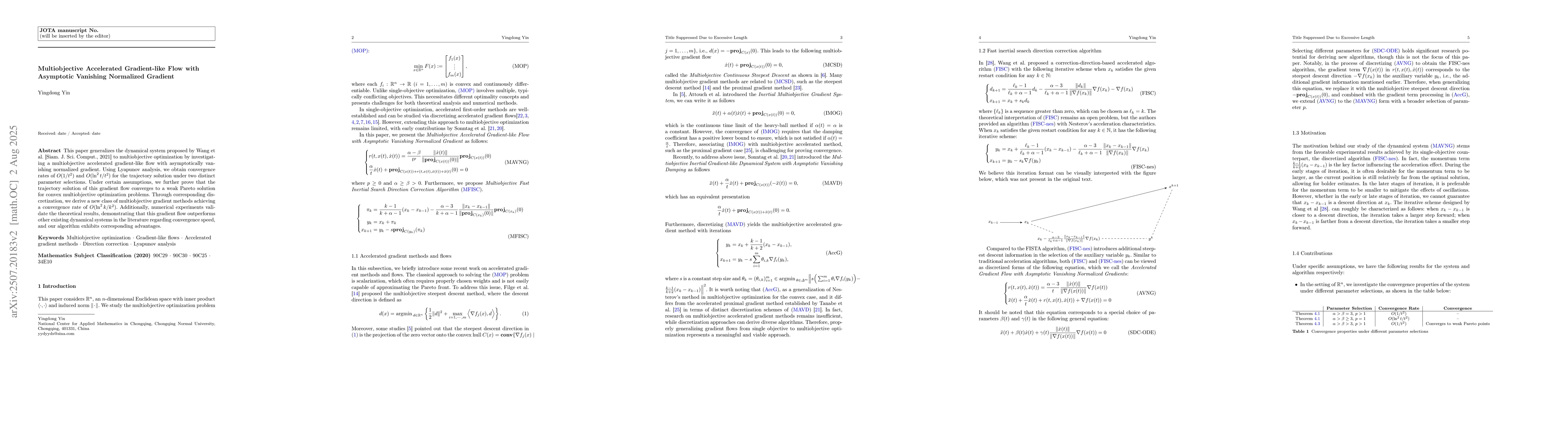In this paper, we extend the gradient system with unit-norm gradient term modification proposed by Wang et al.\cite{wang2021search} to multiobjective optimization, studying the following system: $$ \ddot x(t)+\frac{\alpha }{t}\dot x(t)+\frac{\alpha -\beta }{t^p}\frac{\|\dot x(t)\|}{\|\proj_{C(x(t))}(0)\|}\proj_{C(x(t))}(0)+\proj_{C(x(t))}(-\ddot x(t))=0 $$ where $C(x(t))=\textbf{conv}\{\nabla f_i(x(t)):i=1,\cdots,m\}$, $f_i(x(t)):\R^n\to \R$ are continuously differentiable convex functions, and $\alpha \ge \beta \ge 3$. Under certain assumptions, we establish the existence of trajectory solutions for this system. Using a merit function, we characterize the convergence of trajectory solutions: For $p>1$, $\alpha >\beta \ge 3$, we obtain a convergence rate of $O(1/t^2)$. When $\beta >3$, the trajectory solutions converge to a weak Pareto solution of the multiobjective optimization problem $\min _{x}(f_1(x),\cdots,f_m(x))^\top$. For $p=1$, $\alpha >\beta \ge 3$, we derive a convergence rate of $O(\ln^2 t/t^2)$. We further generalize Wang et al.'s FISC-nes algorithm to multiobjective optimization, achieving a convergence rate of $O(\ln^2k/k^2)$. The numerical experiments demonstrate that our system and algorithm exhibit competitive performance.