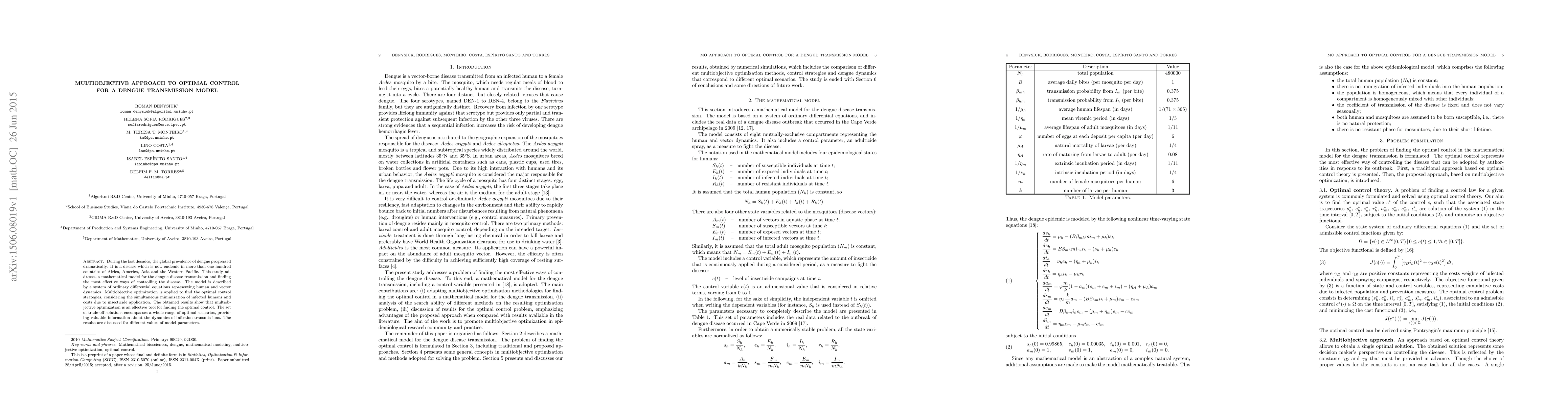 This study develops a multiobjective optimization approach to control dengue transmission, modeled by a system of ordinary differential equations. The optimal control strategies aim to minimize both infected humans and insecticide application costs, demonstrating the effectiveness of this approach in providing a range of trade-off solutions for infection dynamics.