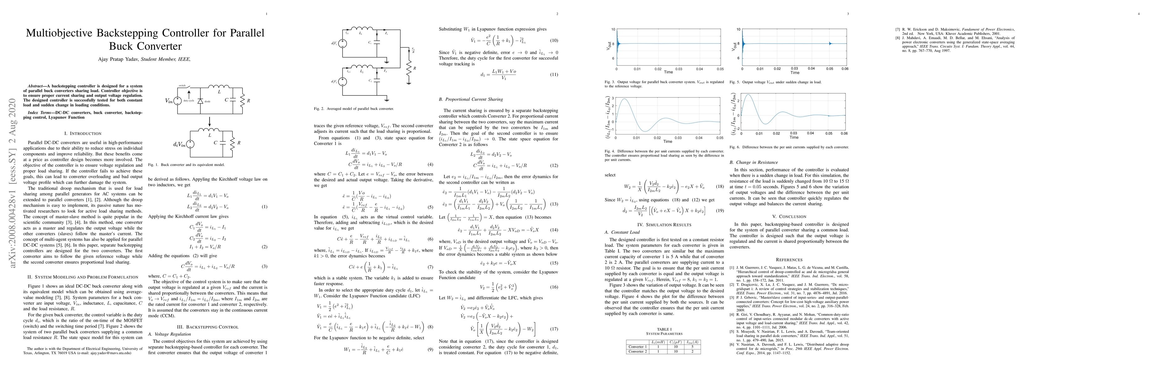 Summary: This paper presents a multiobjective backstepping controller for parallel buck converters to achieve effective current sharing and output voltage regulation. The controller's performance is validated under both constant and varying load conditions.