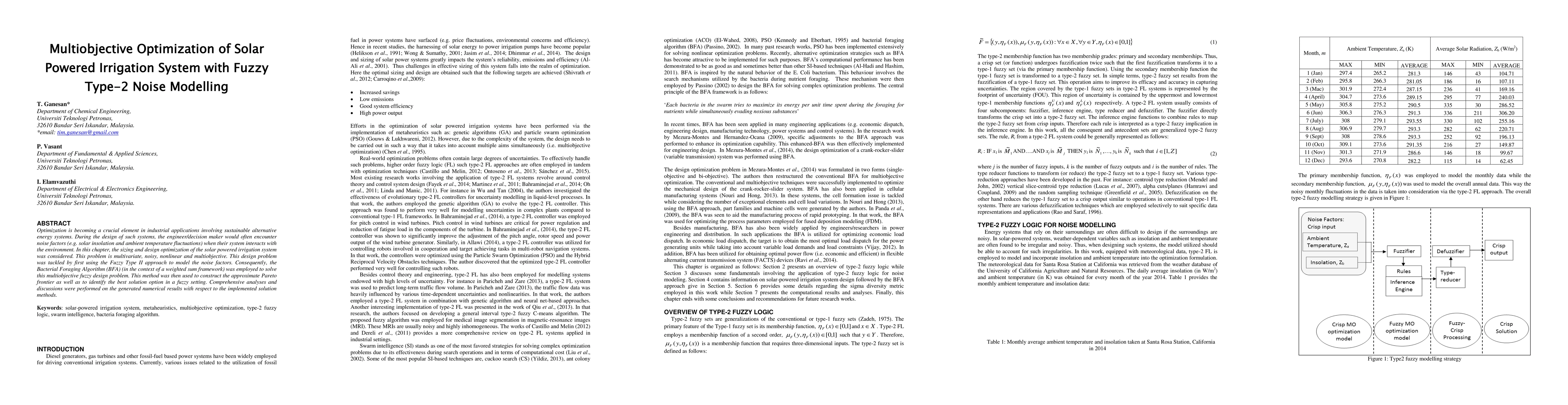 Optimization is becoming a crucial element in industrial applications involving sustainable alternative energy systems. During the design of such systems, the engineer/decision maker would often encounter noise factors (e.g. solar insolation and ambient temperature fluctuations) when their system interacts with the environment. In this chapter, the sizing and design optimization of the solar powered irrigation system was considered. This problem is multivariate, noisy, nonlinear and multiobjective. This design problem was tackled by first using the Fuzzy Type II approach to model the noise factors. Consequently, the Bacterial Foraging Algorithm (BFA) (in the context of a weighted sum framework) was employed to solve this multiobjective fuzzy design problem. This method was then used to construct the approximate Pareto frontier as well as to identify the best solution option in a fuzzy setting. Comprehensive analyses and discussions were performed on the generated numerical results with respect to the implemented solution methods.