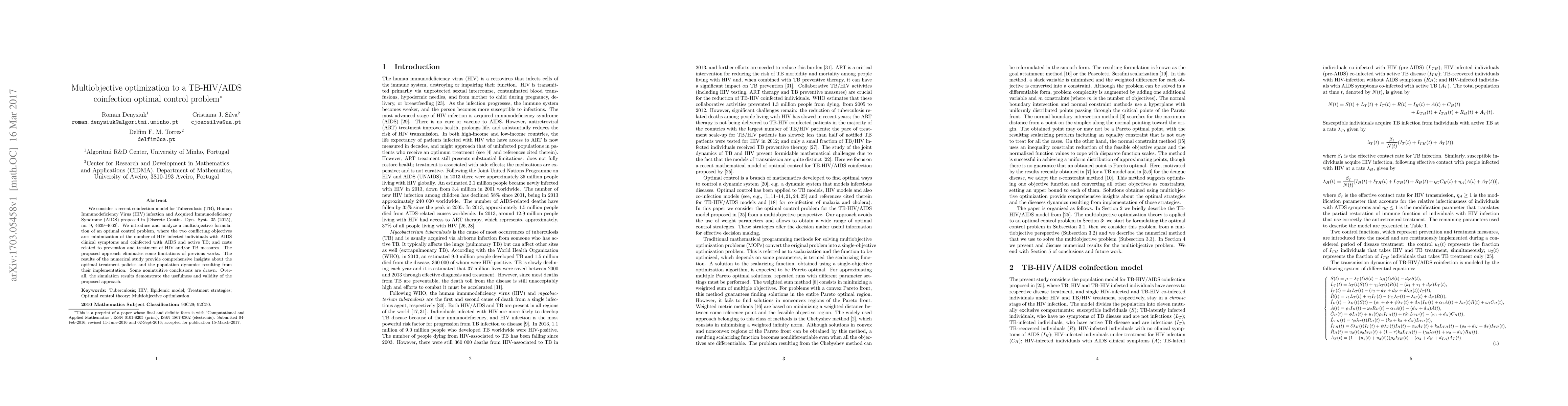This paper proposes a multiobjective optimal control problem for a TB-HIV/AIDS coinfection model, aiming to minimize HIV-infected individuals with AIDS and active TB while reducing costs of prevention and treatment. The study reveals nonintuitive insights into optimal treatment policies and population dynamics.