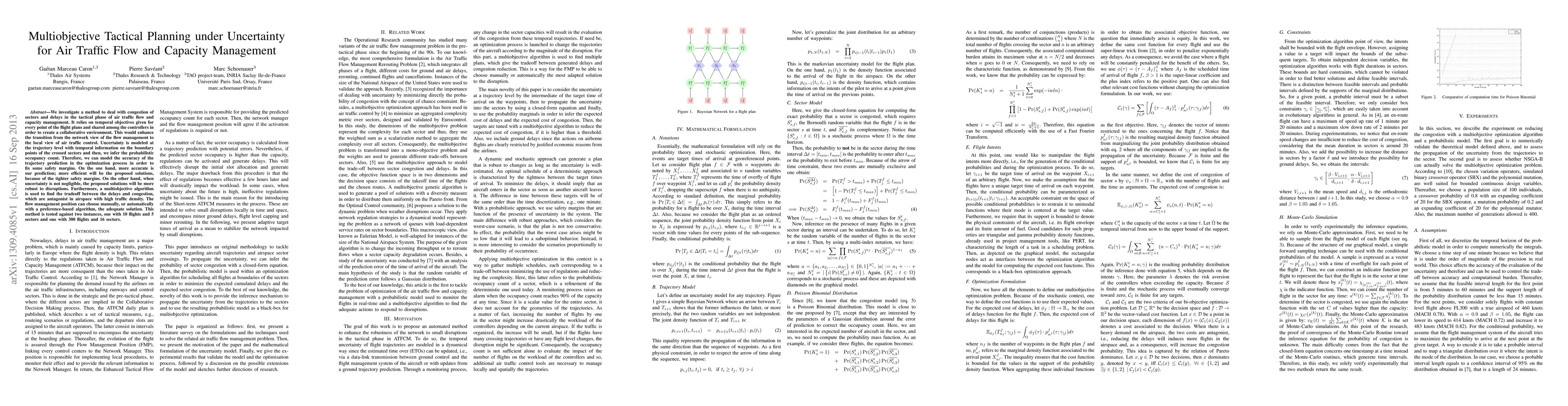 We investigate a method to deal with congestion of sectors and delays in the tactical phase of air traffic flow and capacity management. It relies on temporal objectives given for every point of the flight plans and shared among the controllers in order to create a collaborative environment. This would enhance the transition from the network view of the flow management to the local view of air traffic control. Uncertainty is modeled at the trajectory level with temporal information on the boundary points of the crossed sectors and then, we infer the probabilistic occupancy count. Therefore, we can model the accuracy of the trajectory prediction in the optimization process in order to fix some safety margins. On the one hand, more accurate is our prediction; more efficient will be the proposed solutions, because of the tighter safety margins. On the other hand, when uncertainty is not negligible, the proposed solutions will be more robust to disruptions. Furthermore, a multiobjective algorithm is used to find the tradeoff between the delays and congestion, which are antagonist in airspace with high traffic density. The flow management position can choose manually, or automatically with a preference-based algorithm, the adequate solution. This method is tested against two instances, one with 10 flights and 5 sectors and one with 300 flights and 16 sectors.