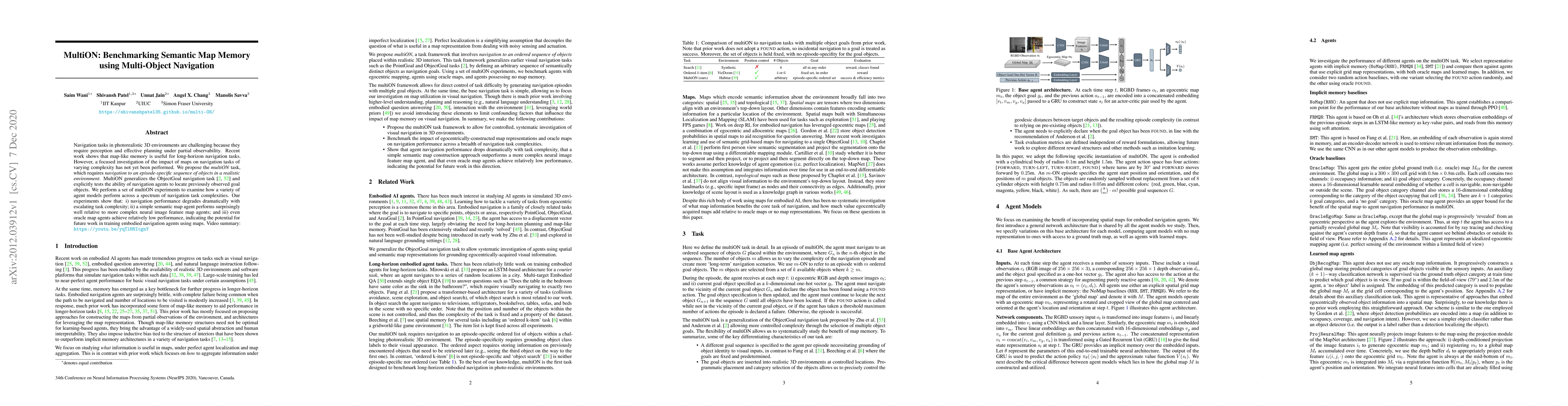The paper introduces the multiON task to benchmark semantic map memory in multi-object navigation, revealing that simpler semantic map agents outperform more complex neural image feature map agents, while even optimal map agents show limited performance, suggesting room for future improvements in navigation agent training.
