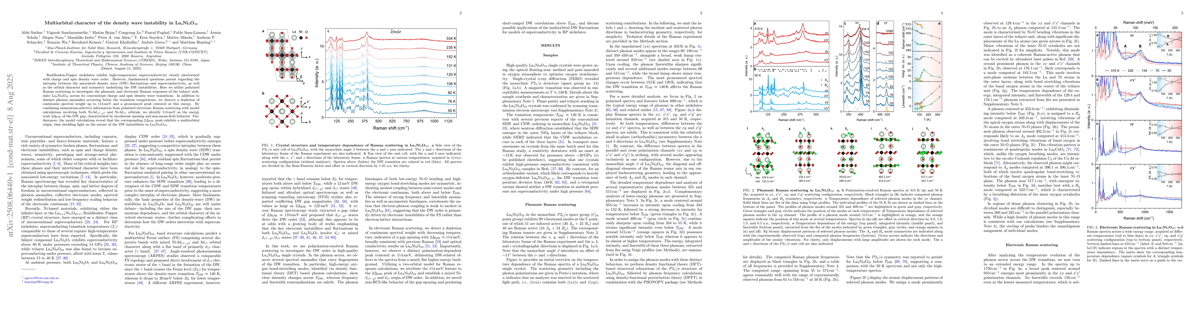 The study combines momentum-selective information from polarized electronic Raman scattering with two-orbital model calculations to identify the multiorbital character of the DW instability in La$_4$Ni$_3$O$_{10}$.