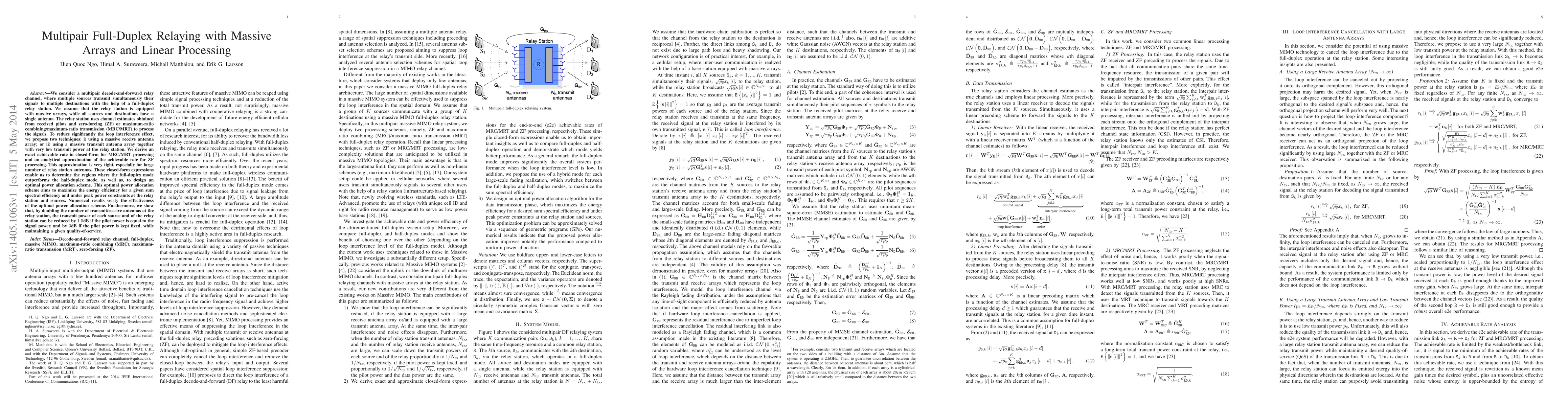 We consider a multipair decode-and-forward relay channel, where multiple sources transmit simultaneously their signals to multiple destinations with the help of a full-duplex relay station. We assume that the relay station is equipped with massive arrays, while all sources and destinations have a single antenna. The relay station uses channel estimates obtained from received pilots and zero-forcing (ZF) or maximum-ratio combining/maximum-ratio transmission (MRC/MRT) to process the signals. To reduce significantly the loop interference effect, we propose two techniques: i) using a massive receive antenna array; or ii) using a massive transmit antenna array together with very low transmit power at the relay station. We derive an exact achievable rate in closed-form for MRC/MRT processing and an analytical approximation of the achievable rate for ZF processing. This approximation is very tight, especially for large number of relay station antennas. These closed-form expressions enable us to determine the regions where the full-duplex mode outperforms the half-duplex mode, as well as, to design an optimal power allocation scheme. This optimal power allocation scheme aims to maximize the energy efficiency for a given sum spectral efficiency and under peak power constraints at the relay station and sources. Numerical results verify the effectiveness of the optimal power allocation scheme. Furthermore, we show that, by doubling the number of transmit/receive antennas at the relay station, the transmit power of each source and of the relay station can be reduced by 1.5dB if the pilot power is equal to the signal power, and by 3dB if the pilot power is kept fixed, while maintaining a given quality-of-service.