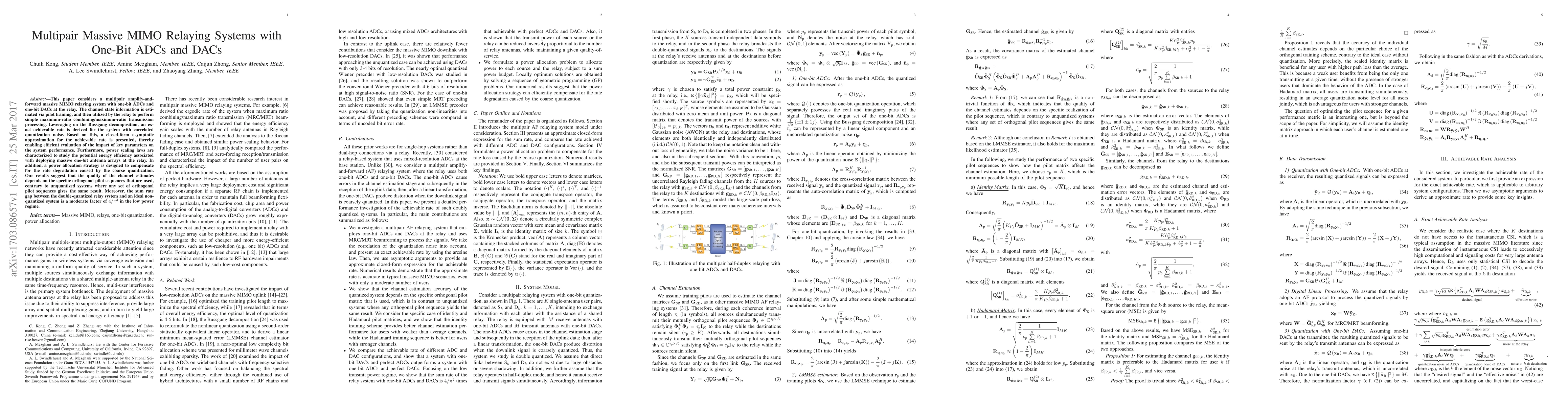 This paper investigates a multipair massive MIMO relaying system with one-bit ADCs and DACs, deriving an exact achievable rate and presenting a closed-form asymptotic approximation to evaluate system performance. It also explores energy efficiency and proposes a power allocation strategy to mitigate rate degradation from coarse quantization.