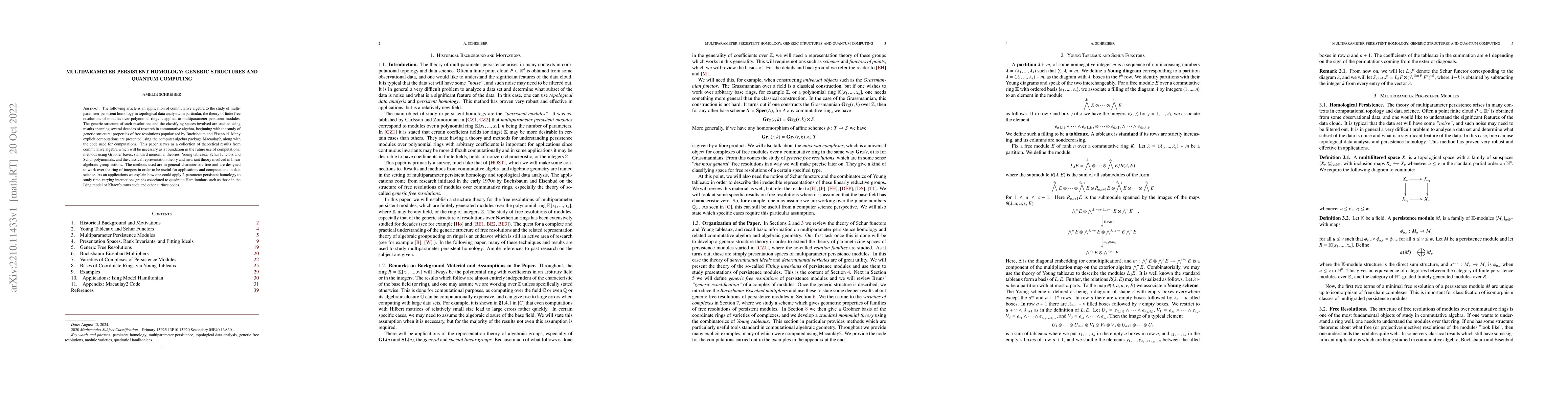 The following article is an application of commutative algebra to the study of multiparameter persistent homology in topological data analysis. In particular, the theory of finite free resolutions of modules over polynomial rings is applied to multiparameter persistent modules. The generic structure of such resolutions and the classifying spaces involved are studied using results spanning several decades of research in commutative algebra, beginning with the study of generic structural properties of free resolutions popularized by Buchsbaum and Eisenbud. Many explicit computations are presented using the computer algebra package Macaulay2, along with the code used for computations. This paper serves as a collection of theoretical results from commutative algebra which will be necessary as a foundation in the future use of computational methods using Gr\"obner bases, standard monomial theories, Young tableaux, Schur functors and Schur polynomials, and the classical representation theory and invariant theory involved in linear algebraic group actions. The methods used are in general characteristic free and are designed to work over the ring of integers in order to be useful for applications and computations in data science. As an applications we explain how one could apply 2-parameter persistent homology to study time-varying interactions graphs associated to quadratic Hamiltonians such as those in the Ising model or Kitaev's torus code and other surface codes.
