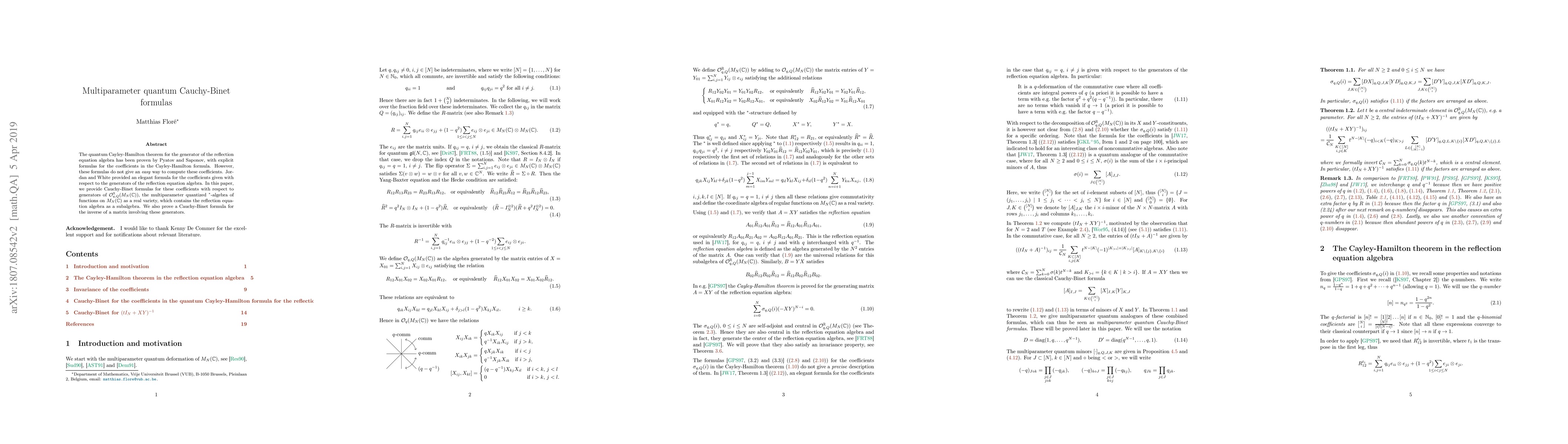 The quantum Cayley-Hamilton theorem for the generator of the reflection equation algebra has been proven by Pyatov and Saponov, with explicit formulas for the coefficients in the Cayley-Hamilton formula. However, these formulas do not give an \emph{easy} way to compute these coefficients. Jordan and White provided an elegant formula for the coefficients given with respect to the generators of the reflection equation algebra. In this paper, we provide Cauchy-Binet formulas for these coefficients with respect to generators of $\mathcal{O}_{q,Q}^{\mathbb{R}}(M_{N}(\mathbb{C}))$, the multiparameter quantized $^{*}$-algebra of functions on $M_{N}(\mathbb{C})$ as a real variety, which contains the reflection equation algebra as a subalgebra. We also prove a Cauchy-Binet formula for the inverse of a matrix involving these generators.