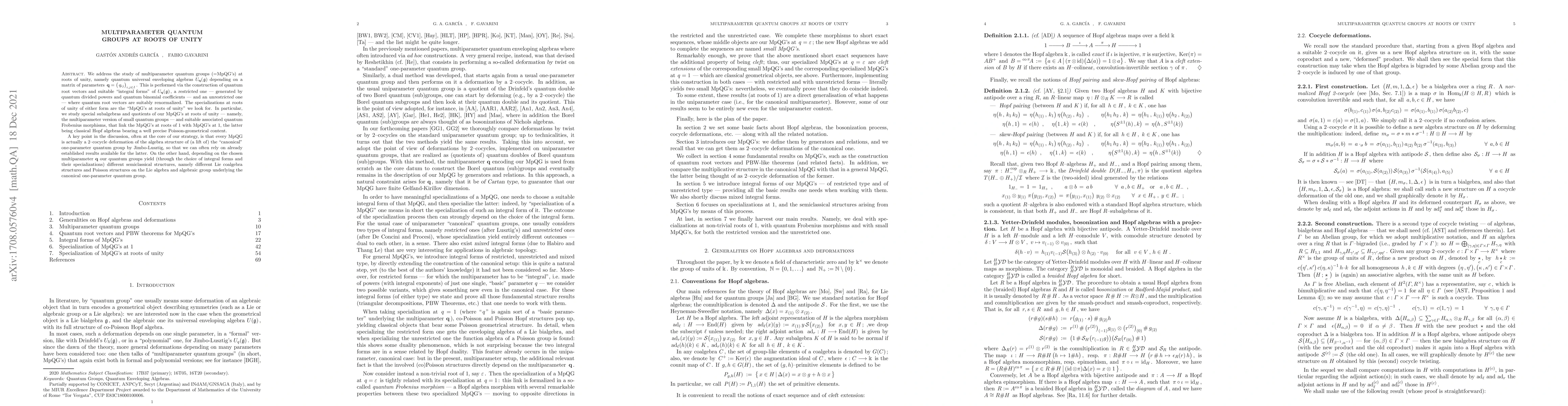 We address the study of multiparameter quamtum groups (=MpQG's) at roots of unity, namely quantum universal enveloping algebras $ U_{\boldsymbol{\rm q}}(\mathfrak{g}) $ depending on a matrix of parameters $ \boldsymbol{\rm q} = {\big( q_{ij} \big)}_{i, j \in I} \, $. This is performed via the construction of quantum root vectors and suitable "integral forms" of $ U_{\boldsymbol{\rm q}}(\mathfrak{g}) \, $, a \textsl{restricted one} - generated by quantum divided powers and quantum binomial coefficients - and an \textsl{unrestricted\/} one - where quantum root vectors are suitably renormalized. The specializations at roots of unity of either forms are the "MpQG's at roots of unity" we look for. In particular, we study special subalgebras and quotients of our MpQG's at roots of unity - namely, the multiparameter version of small quantum groups - and suitable associated quantum Frobenius morphisms, that link the MpQG's at roots of 1 with MpQG's at 1, the latter being classical Hopf algebras bearing a well precise Poisson-geometrical content. A key point in the discussion - often at the core of our strategy - is that every MpQG is actually a 2-cocycle deformation of the algebra structure of (a lift of) the "canonical" one-parameter quantum group by Jimbo-Lusztig, so that we can often rely on already established results available for the latter. On the other hand, depending on the chosen multiparameter $ \boldsymbol{\rm q} $ our quantum groups yield (through the choice of integral forms and their specialization) different semiclassical structures, namely different Lie coalgebra structures and Poisson structures on the Lie algebra and algebraic group underlying the canonical one-parameter quantum group.