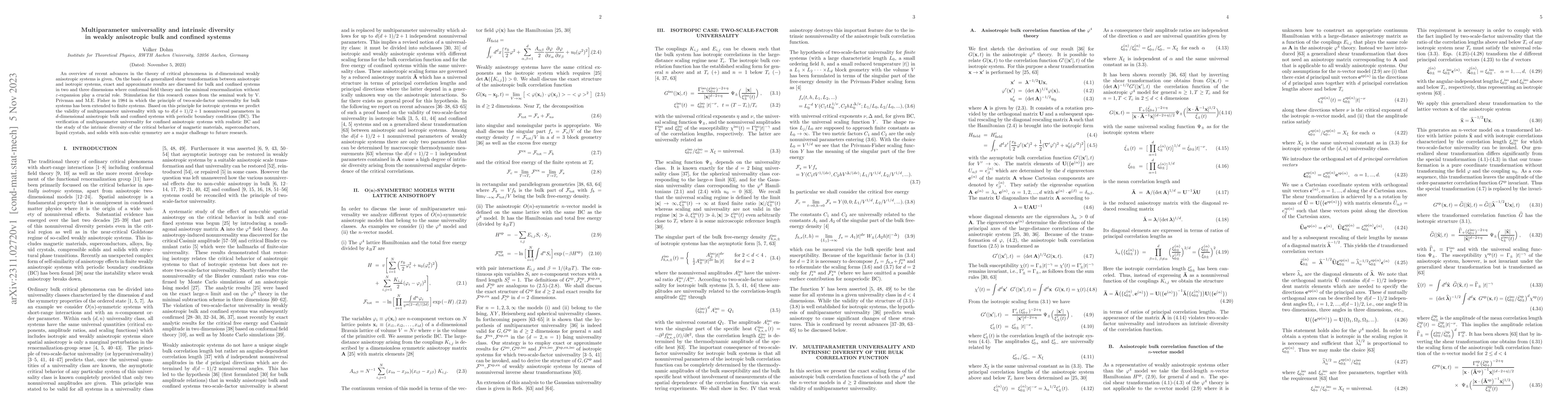 An overview of recent advances in the theory of critical phenomena in $d$-dimensional weakly anisotropic systems is given. On the basis of a generalized shear transformation between anisotropic and isotropic systems, exact and approximate results are discussed for bulk and confined systems in two and three dimensions where conformal field theory and the minimal renormalization without $\varepsilon$-expansion play a crucial role. Stimulation for this research comes from the seminal work by V. Privman and M.E. Fisher in 1984 in which the principle of two-scale-factor universality for bulk systems has been extended to finite systems. Based on this principle for isotropic systems we predict the validity of multiparameter universality with up to $d(d+1)/2+1$ nonuniversal parameters in $d$-dimensional anisotropic bulk and confined systems with periodic boundary conditions (BC). The verification of multiparameter universality for confined anisotropic systems with realistic BC and the study of the intrinsic diversity of the critical behavior of magnetic materials, superconductors, liquid crystals, and solids with non-cubic symmetry are a major challenge to future research.