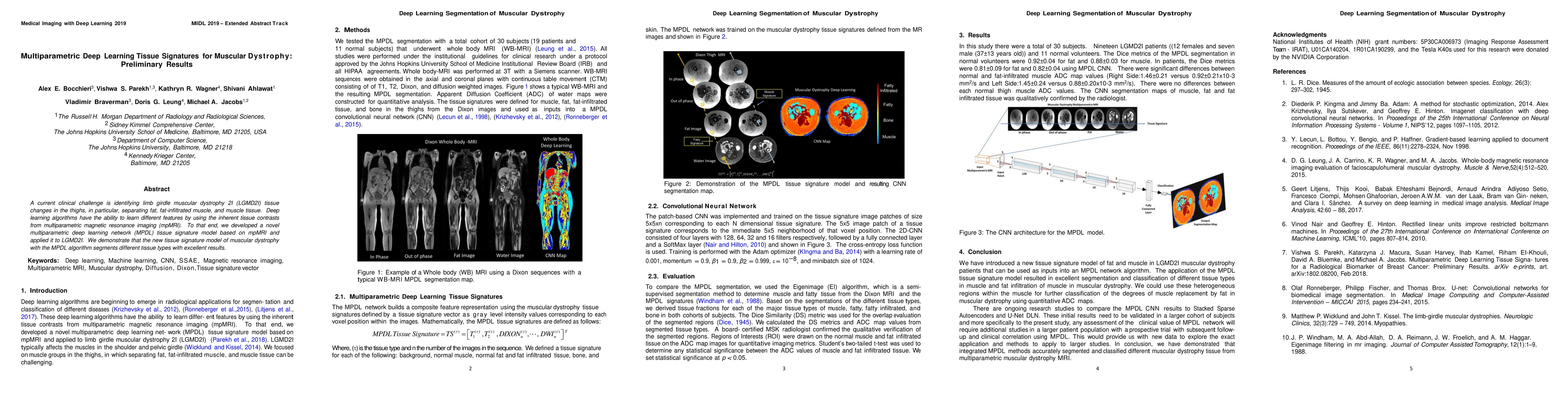 A current clinical challenge is identifying limb girdle muscular dystrophy 2I(LGMD2I)tissue changes in the thighs, in particular, separating fat, fat-infiltrated muscle, and muscle tissue. Deep learning algorithms have the ability to learn different features by using the inherent tissue contrasts from multiparametric magnetic resonance imaging (mpMRI). To that end, we developed a novel multiparametric deep learning network (MPDL) tissue signature model based on mpMRI and applied it to LGMD2I. We demonstrate a new tissue signature model of muscular dystrophy with the MPDL algorithm segments different tissue types with excellent results.