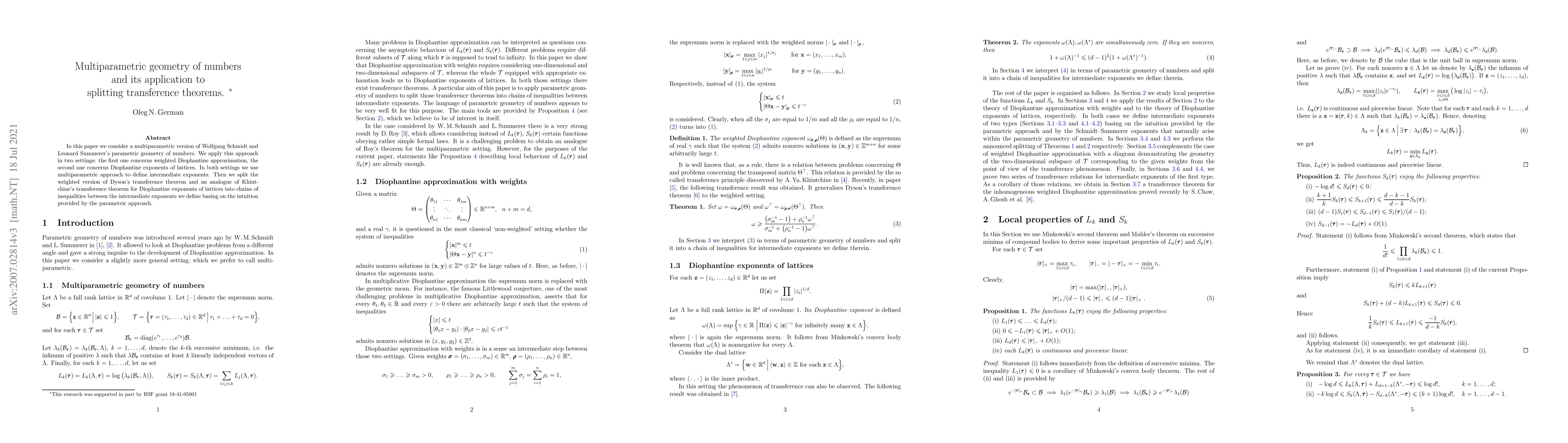 This paper develops a multiparametric version of the geometry of numbers, applying it to weighted Diophantine approximation and Diophantine exponents of lattices. It defines intermediate exponents and splits transference theorems into chains of inequalities based on these new definitions.