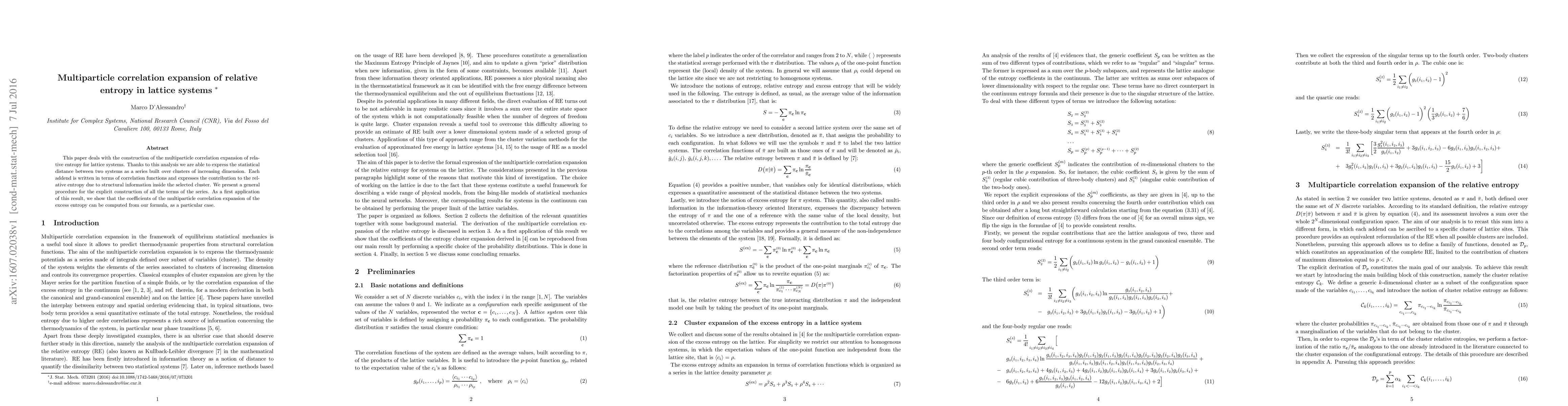 This paper deals with the construction of the multiparticle correlation expansion of relative entropy for lattice systems. Thanks to this analysis we are able to express the statistical distance between two systems as a series built over clusters of increasing dimension. Each addend is written in terms of correlation functions and expresses the contribution to the relative entropy due to structural information inside the selected cluster. We present a general procedure for the explicit construction of all the terms of the series. As a first application of this result, we show that the coefficients of the multiparticle correlation expansion of the excess entropy can be computed from our formula, as a particular case.