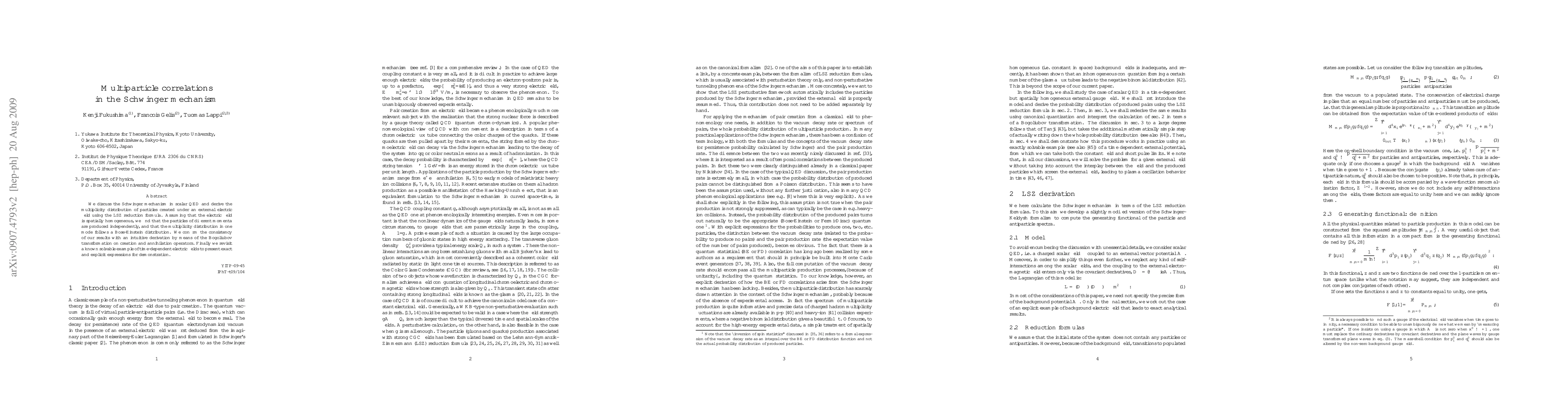 We discuss the Schwinger mechanism in scalar QED and derive the multiplicity distribution of particles created under an external electric field using the LSZ reduction formula. Assuming that the electric field is spatially homogeneous, we find that the particles of different momenta are produced independently, and that the multiplicity distribution in one mode follows a Bose-Einstein distribution. We confirm the consistency of our results with an intuitive derivation by means of the Bogoliubov transformation on creation and annihilation operators. Finally we revisit a known solvable example of time-dependent electric fields to present exact and explicit expressions for demonstration.