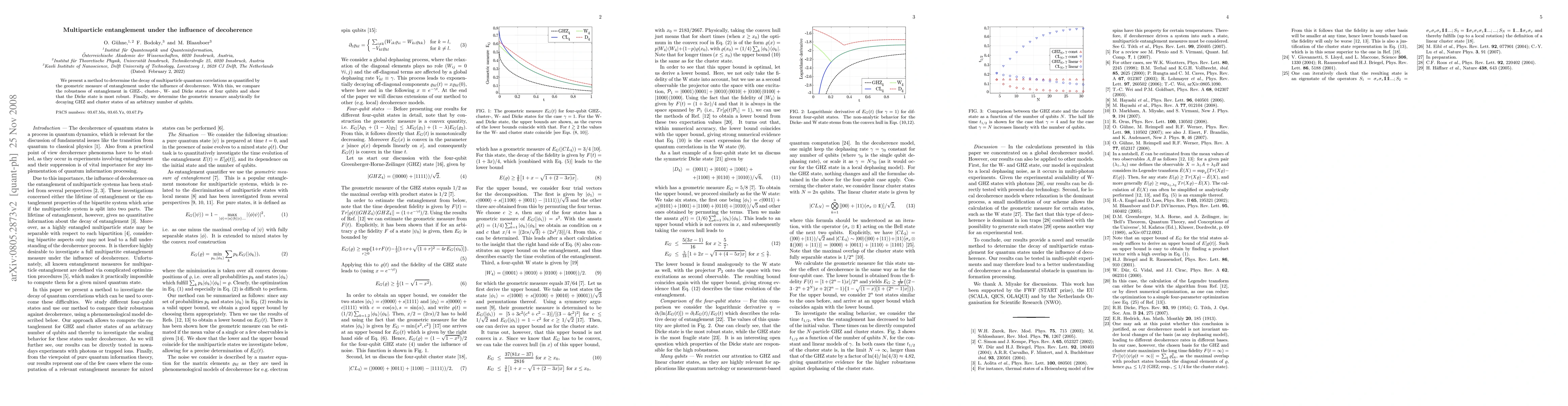 This paper develops a method to quantify the decay of multiparticle quantum correlations due to decoherence, comparing the robustness of entanglement in GHZ, cluster, W, and Dicke states of four qubits. It finds that the Dicke state exhibits the highest robustness, and analytically determines the geometric measure for decaying GHZ and cluster states with any number of qubits.
