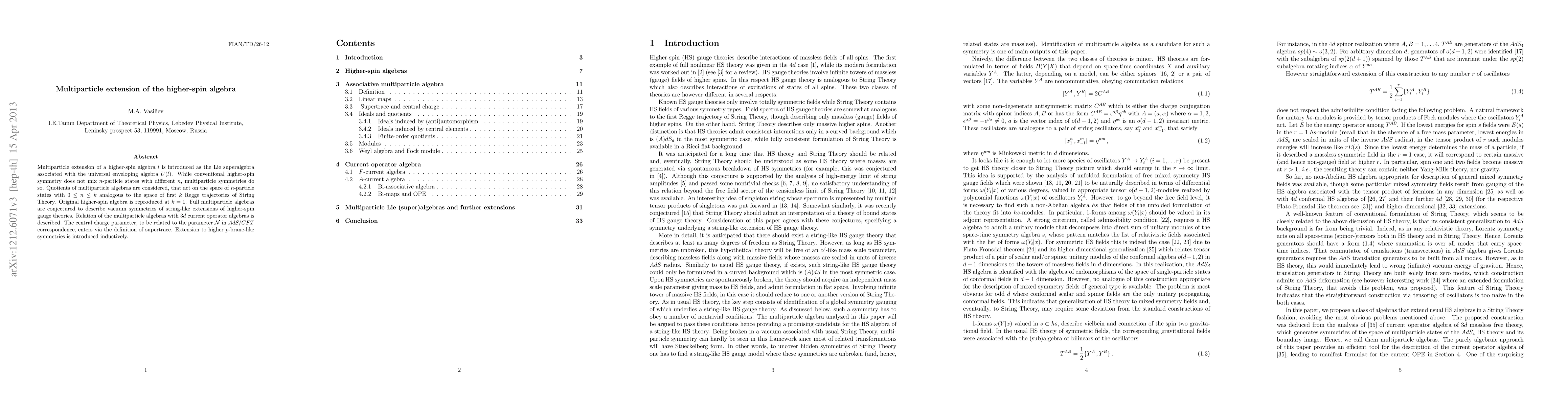 Multiparticle extension of a higher-spin algebra $l$ is introduced as the Lie superalgebra associated with the universal enveloping algebra $U(l)$. While conventional higher-spin symmetry does not mix $n$-particle states with different $n$, multiparticle symmetries do so. Quotients of multiparticle algebras are considered, that act on the space of $n$-particle states with $0\leq n\leq k$ analogous to the space of first $k$ Regge trajectories of String Theory. Original higher-spin algebra is reproduced at $k=1$. Full multiparticle algebras are conjectured to describe vacuum symmetries of string-like extensions of higher-spin gauge theories. Relation of the multiparticle algebras with 3d current operator algebras is described. The central charge parameter, to be related to the parameter ${\mathcal N}$ in $AdS/CFT$ correspondence, enters via the definition of supertrace. Extension to higher $p$-brane-like symmetries is introduced inductively.