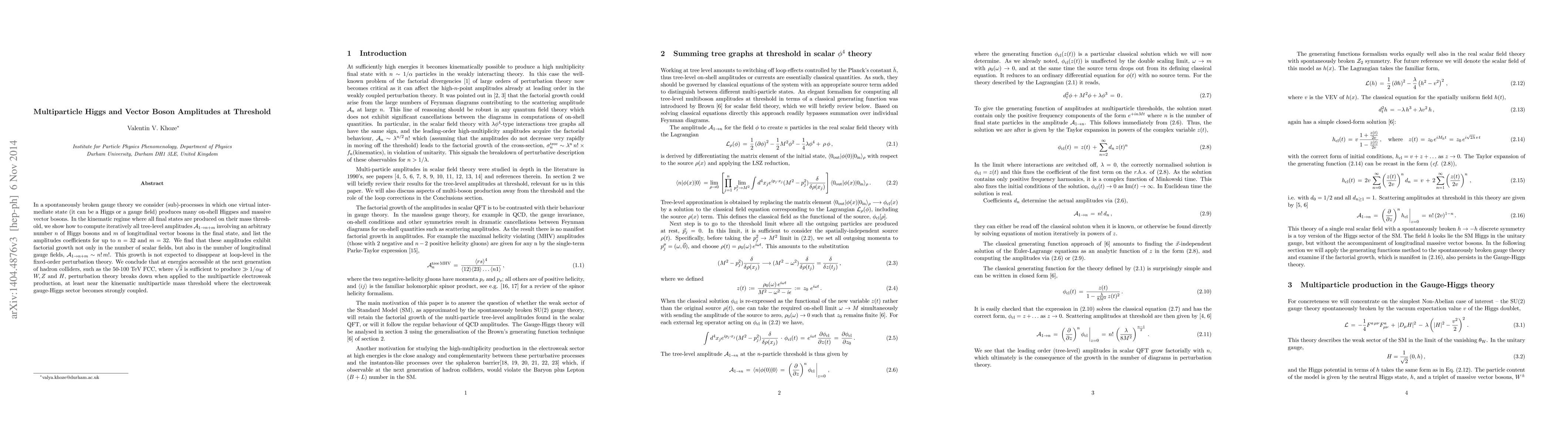 In a spontaneously broken gauge theory we consider (sub)-processes in which one virtual intermediate state (it can be a Higgs or a gauge field) produces many on-shell Higgses and massive vector bosons. In the kinematic regime where all final states are produced on their mass threshold, we show how to compute iteratively all tree-level amplitudes ${\cal A}_{1\to n+m}$ involving an arbitrary number $n$ of Higgs bosons and $m$ of longitudinal vector bosons in the final state, and list the amplitudes coefficients for up to $n=32$ and $m=32$. We find that these amplitudes exhibit factorial growth not only in the number of scalar fields, but also in the number of longitudinal gauge fields, ${\cal A}_{1\to n+m} \sim n! \,m!$. This growth is not expected to disappear at loop-level in the fixed-order perturbation theory. We conclude that at energies accessible at the next generation of hadron colliders, such as the 50-100 TeV FCC, where $\sqrt{\hat{s}}$ is sufficient to produce $\gg 1/\alpha_W$ of $W,Z$ and $H$, perturbation theory breaks down when applied to the multiparticle electroweak production, at least near the kinematic multiparticle mass threshold where the electroweak gauge-Higgs sector becomes strongly coupled.