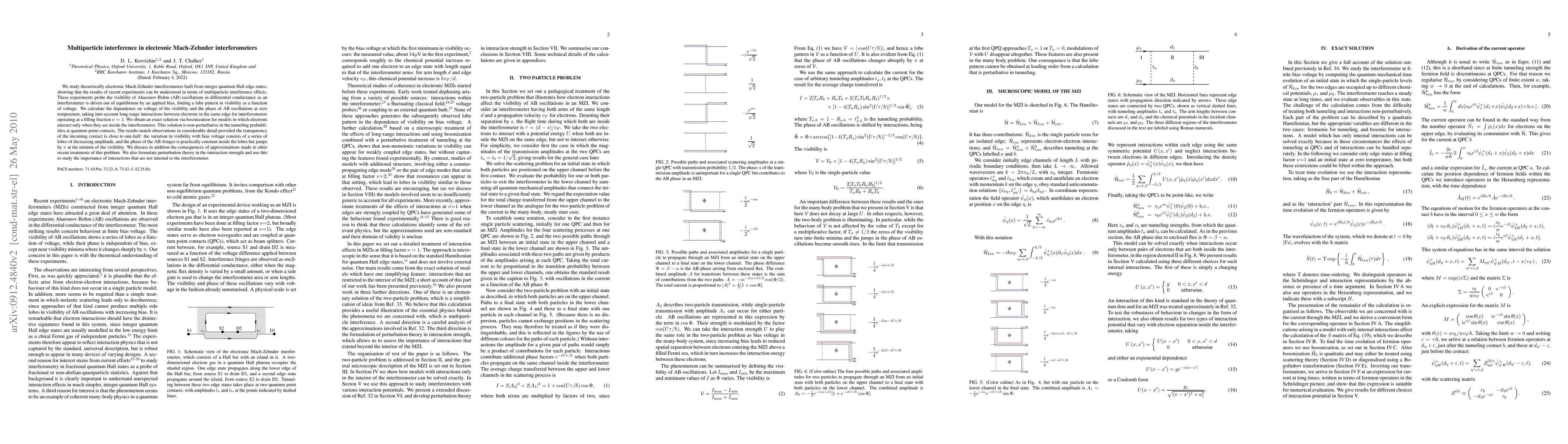 This paper theoretically investigates electronic Mach-Zehnder interferometers using integer quantum Hall edge states, demonstrating that multiparticle interference explains recent experimental observations of Aharonov-Bohm oscillations' visibility patterns under bias. The study provides an exact solution via bosonization, showing that visibility varies in a lobe pattern with voltage and the phase of AB-fringes jumps by $\pi$ at visibility minima.