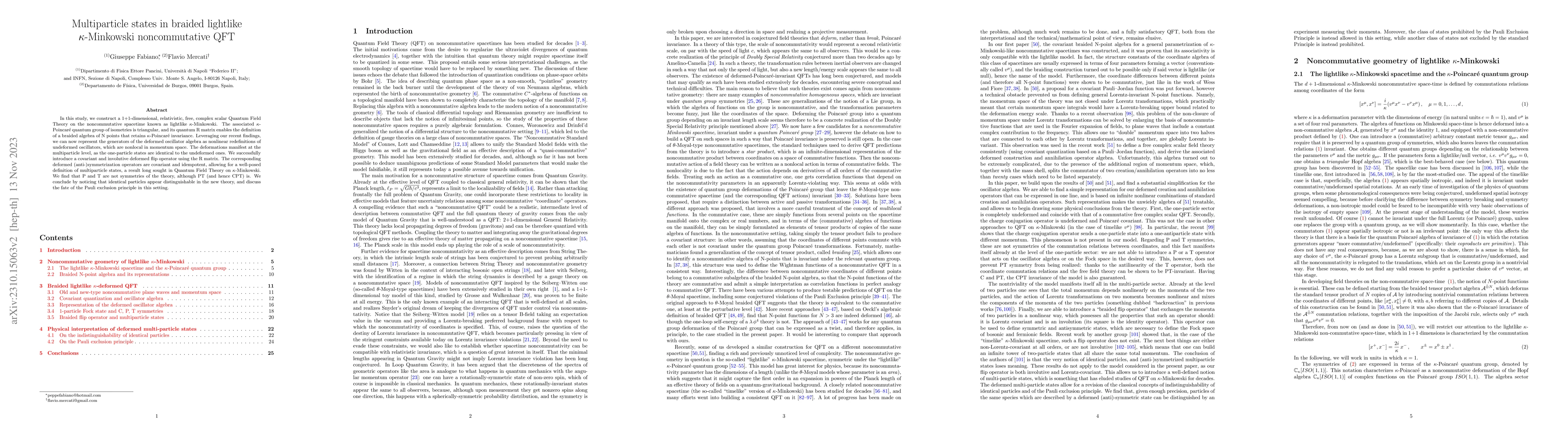 In this study, we construct a 1+1-dimensional, relativistic, free, complex scalar Quantum Field Theory on the noncommutative spacetime known as lightlike $\kappa$-Minkowski. The associated $\kappa$-Poincar\'e quantum group of isometries is triangular, and its quantum R matrix enables the definition of a braided algebra of N points that retains $\kappa$-Poincar\'e invariance. Leveraging our recent findings, we can now represent the generators of the deformed oscillator algebra as nonlinear redefinitions of undeformed oscillators, which are nonlocal in momentum space. The deformations manifest at the multiparticle level, as the one-particle states are identical to the undeformed ones. We successfully introduce a covariant and involutive deformed flip operator using the R matrix. The corresponding deformed (anti-)symmetrization operators are covariant and idempotent, allowing for a well-posed definition of multiparticle states, a result long sought in Quantum Field Theory on $\kappa$-Minkowski. We find that P and T are not symmetries of the theory, although PT (and hence CPT) is. We conclude by noticing that identical particles appear distinguishable in the new theory, and discuss the fate of the Pauli exclusion principle in this setting.