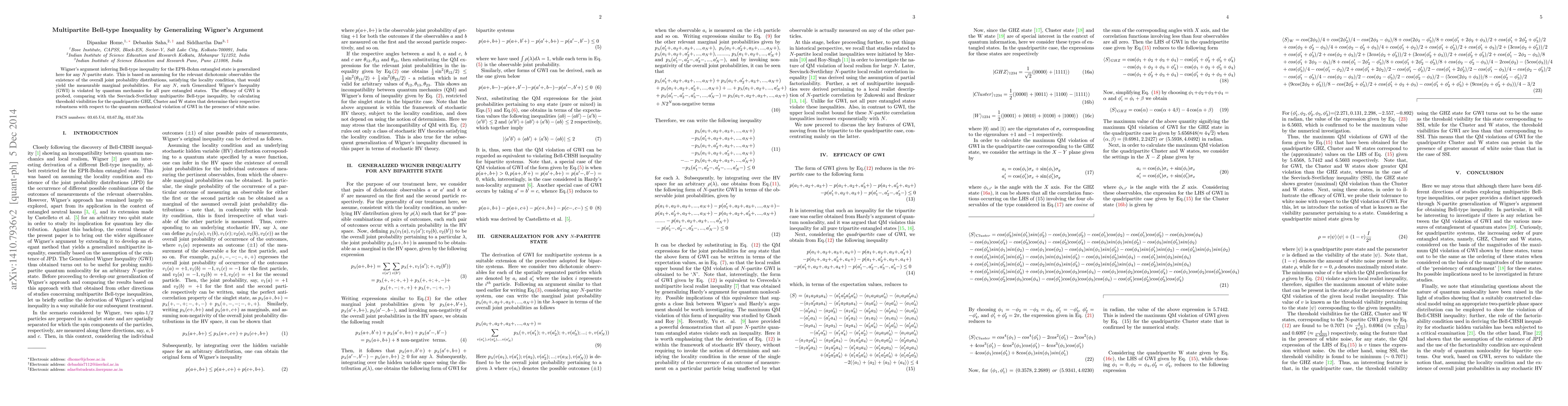Wigner's argument inferring Bell-type inequality for the EPR-Bohm entangled state is generalized here for any N-partite state. This is based on assuming for the relevant dichotomic observables the existence of the overall joint probability distributions, satisfying the locality condition, that would yield the measurable marginal probabilities. For any N, such Generalized Wigner's Inequality (GWI) is violated by quantum mechanics for all pure entangled states. The efficacy of GWI is probed, comparing with the Seevinck-Svetlichny multipartite Bell-type inequality, by calculating threshold visibilities for the quadripartite GHZ, Cluster andWstates that determine their respective robustness with respect to the quantum mechanical violation of GWI in the presence of white noise.