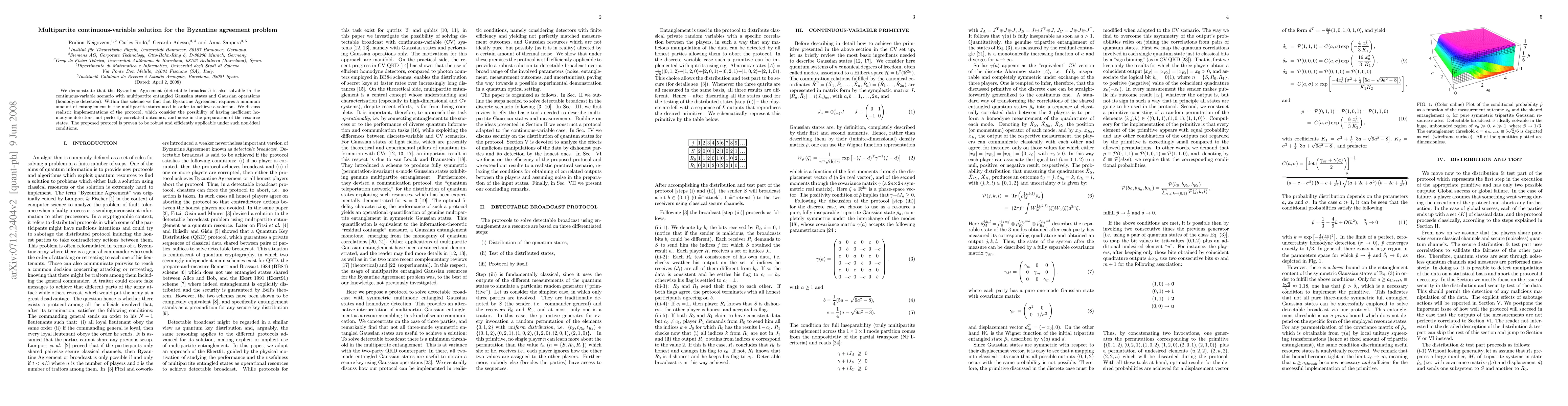 We demonstrate that the Byzantine Agreement (detectable broadcast) is also solvable in the continuous-variable scenario with multipartite entangled Gaussian states and Gaussian operations (homodyne detection). Within this scheme we find that Byzantine Agreement requires a minimum amount of entanglement in the multipartite states used in order to achieve a solution. We discuss realistic implementations of the protocol, which consider the possibility of having inefficient homodyne detectors, not perfectly correlated outcomes, and noise in the preparation of the resource states. The proposed protocol is proven to be robust and efficiently applicable under such non-ideal conditions.