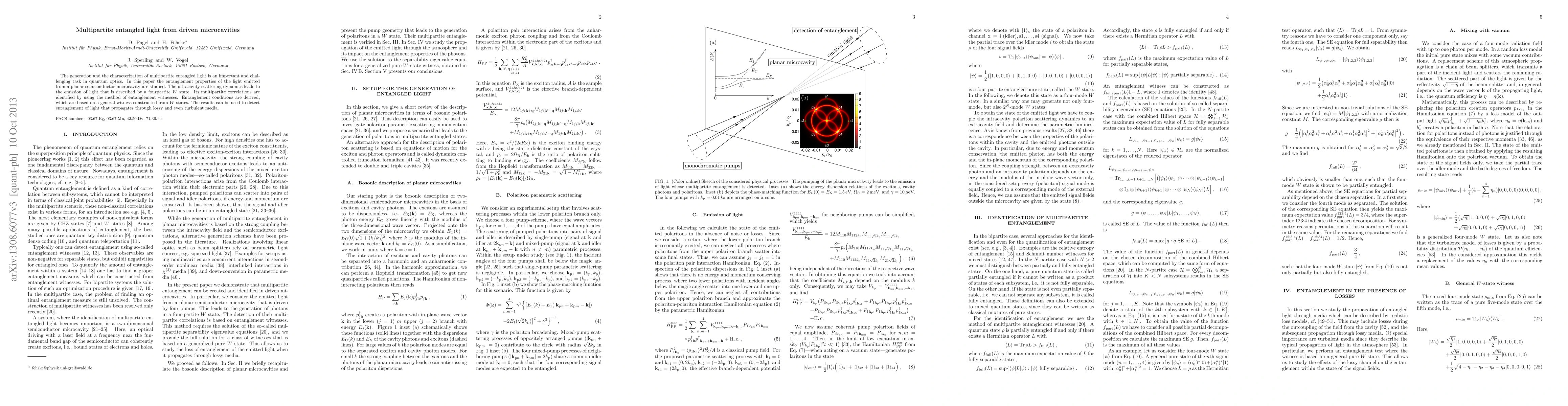 This paper investigates the generation of multipartite entangled light from driven semiconductor microcavities, demonstrating the emission of a fourpartite W state. The study employs entanglement witnesses to identify and characterize these correlations, providing a method for detecting such entanglement in lossy and turbulent media.