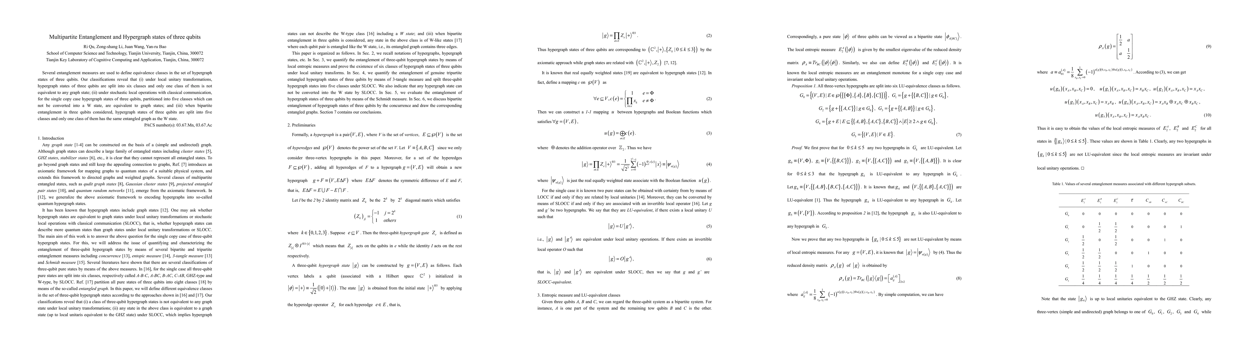 This paper classifies hypergraph states of three qubits using various entanglement measures, revealing that under local unitary transformations, these states are divided into six classes, with only one class differing from graph states. Additionally, under stochastic local operations, they are grouped into five classes equivalent to graph states except for those that cannot convert to a W state.