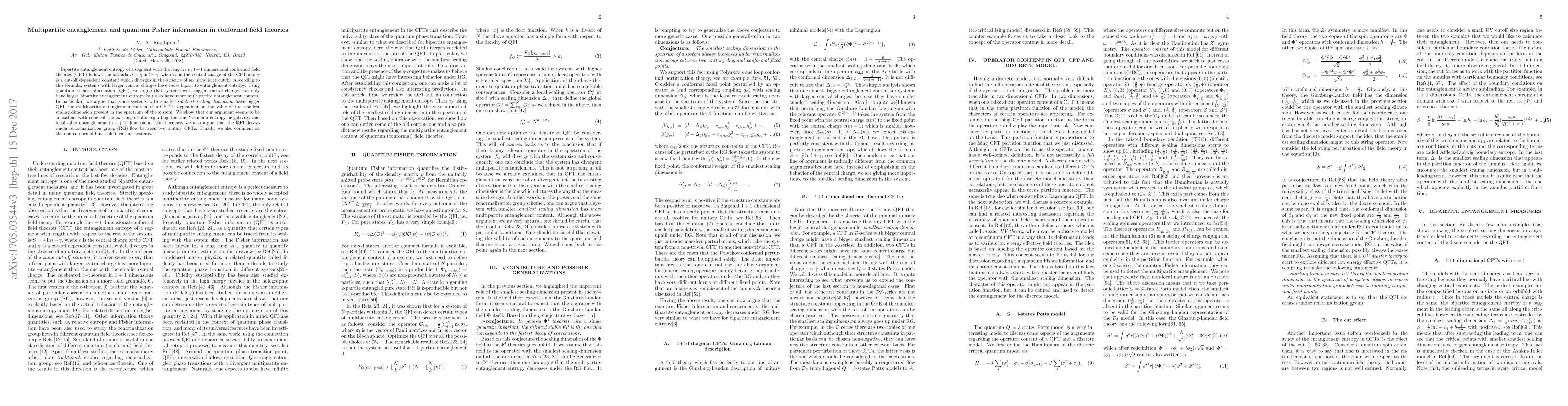 Bipartite entanglement entropy of a segment with the length $l$ in $1+1$ dimensional conformal field theories (CFT) follows the formula $S=\frac{c}{3}\ln l+\gamma$, where $c$ is the central charge of the CFT and $\gamma$ is a cut-off dependent constant which diverges in the absence of an ultraviolet cutoff. According to this formula, systems with larger central charges have {\it{more}} bipartite entanglement entropy. Using quantum Fisher information (QFI), we argue that systems with bigger central charges not only have larger bipartite entanglement entropy but also have more multipartite entanglement content. In particular, we argue that since systems with smaller {\it{smallest scaling dimension}} have bigger QFI, the multipartite entanglement content of a CFT is dependent on the value of the smallest scaling dimension present in the spectrum of the system. We show that our argument seems to be consistent with some of the existing results regarding the von Neumann entropy, negativity, and localizable entanglement in $1+1$ dimensions. Furthermore, we also argue that the QFI decays under renormalization group (RG) flow between two unitary CFTs. Finally, we also comment on the non-conformal but scale invariant systems.