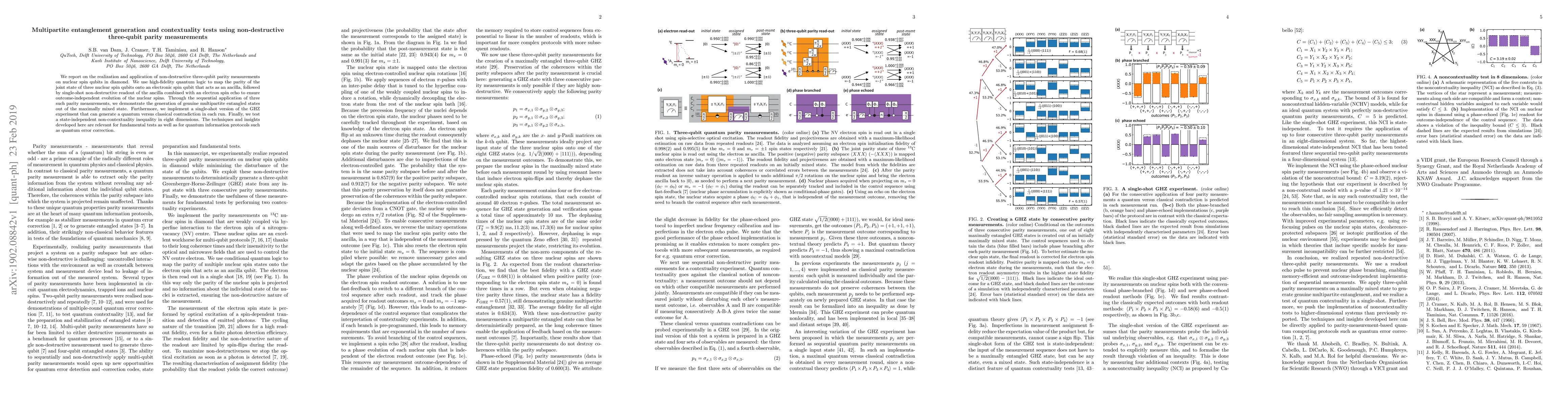 We report on the realization and application of non-destructive three-qubit parity measurements on nuclear spin qubits in diamond. We use high-fidelity quantum logic to map the parity of the joint state of three nuclear spin qubits onto an electronic spin qubit that acts as an ancilla, followed by single-shot non-destructive readout of the ancilla combined with an electron spin echo to ensure outcome-independent evolution of the nuclear spins. Through the sequential application of three such parity measurements, we demonstrate the generation of genuine multipartite entangled states out of the maximally mixed state. Furthermore, we implement a single-shot version of the GHZ experiment that can generate a quantum versus classical contradiction in each run. Finally, we test a state-independent non-contextuality inequality in eight dimensions. The techniques and insights developed here are relevant for fundamental tests as well as for quantum information protocols such as quantum error correction.