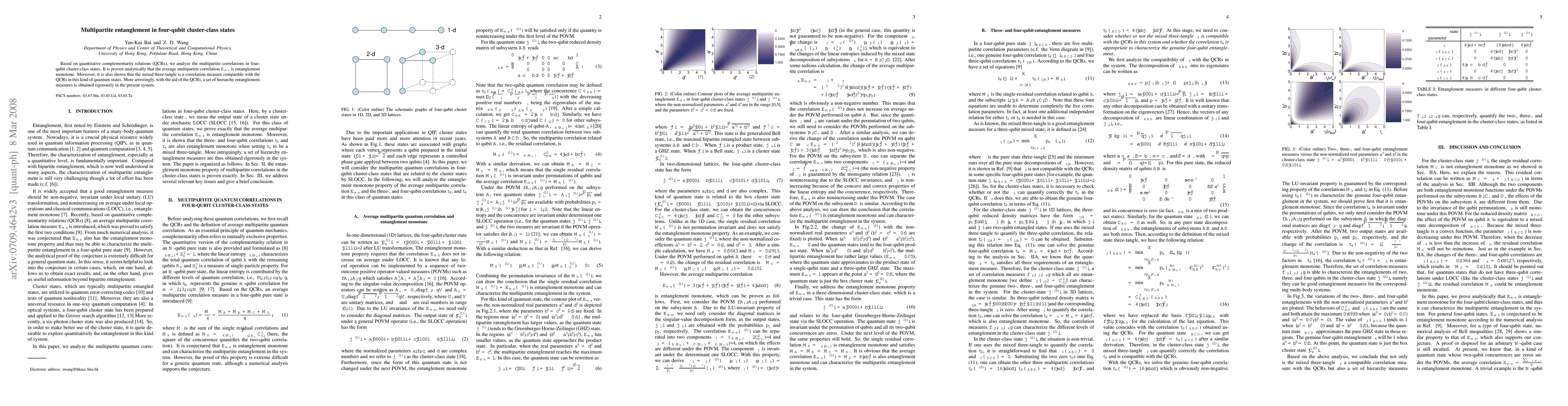 This paper analyzes multipartite entanglement in four-qubit cluster-class states using quantitative complementarity relations (QCRs), proving that the average multipartite correlation $E_{ms}$ is an entanglement monotone. It also demonstrates that the mixed three-tangle serves as a compatible correlation measure and derives a hierarchy of entanglement measures for these quantum states.
