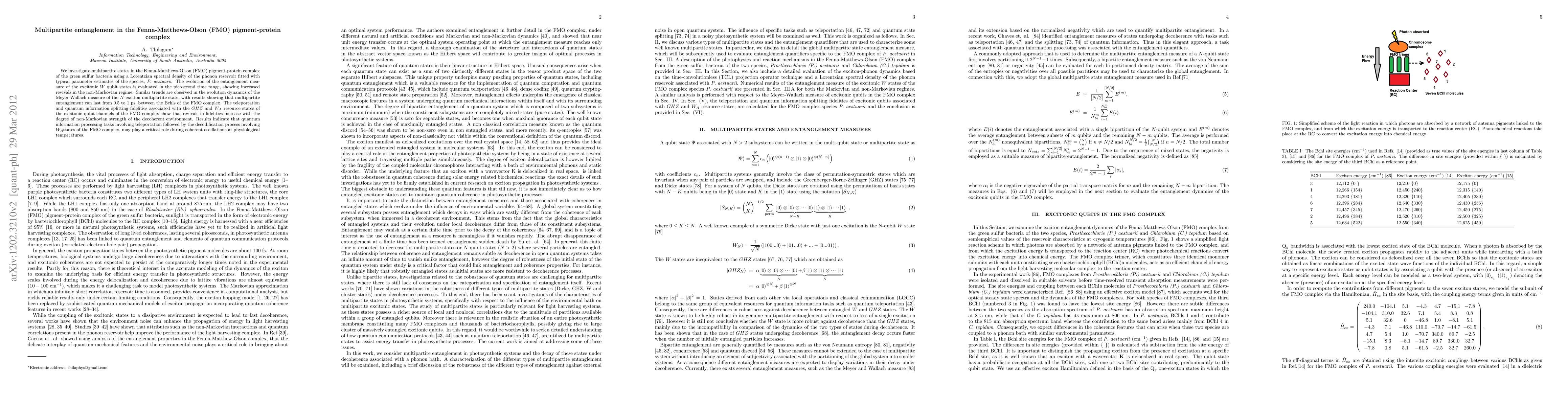 This paper explores multipartite entanglement in the FMO pigment-protein complex, revealing that entanglement revivals increase in non-Markovian conditions, with multipartite entanglement lasting up to 1 picosecond. Quantum information processing tasks, such as teleportation, show enhanced fidelity in non-Markovian environments.