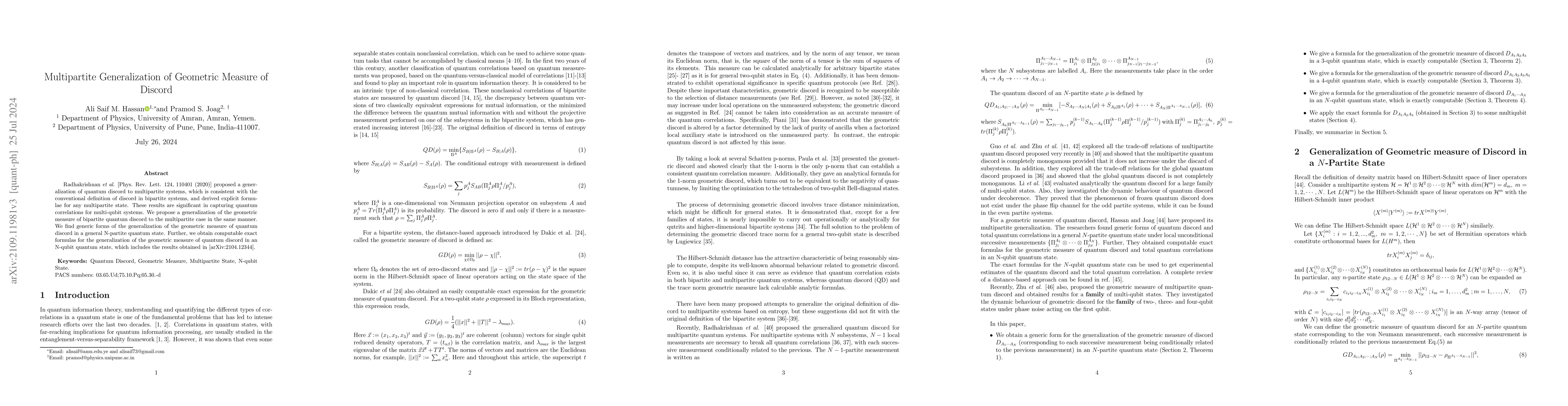 This paper generalizes the geometric measure of quantum discord to multipartite systems, extending the work of Radhakrishnan et al. on multipartite quantum discord. The authors derive explicit, computable formulas for the geometric measure in N-qubit quantum states, providing a significant advancement in understanding quantum correlations in multi-qubit systems.
