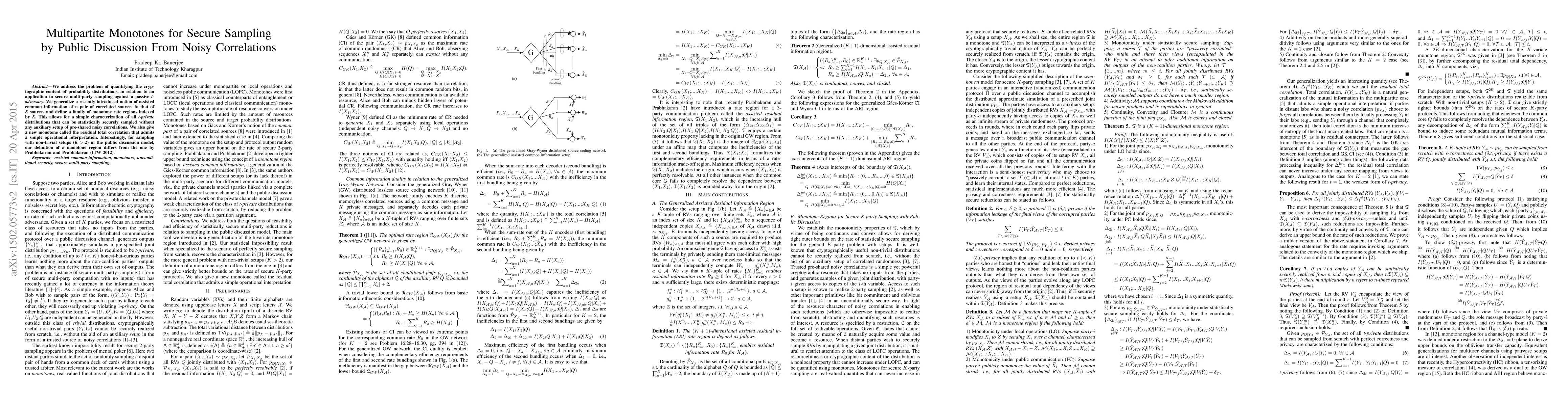 We address the problem of quantifying the cryptographic content of probability distributions, in relation to an application to secure multi-party sampling against a passive t-adversary. We generalize a recently introduced notion of assisted common information of a pair of correlated sources to that of K sources and define a family of monotone rate regions indexed by K. This allows for a simple characterization of all t-private distributions that can be statistically securely sampled without any auxiliary setup of pre-shared noisy correlations. We also give a new monotone called the residual total correlation that admits a simple operational interpretation. Interestingly, for sampling with non-trivial setups (K > 2) in the public discussion model, our definition of a monotone region differs from the one by Prabhakaran and Prabhakaran (ITW 2012).