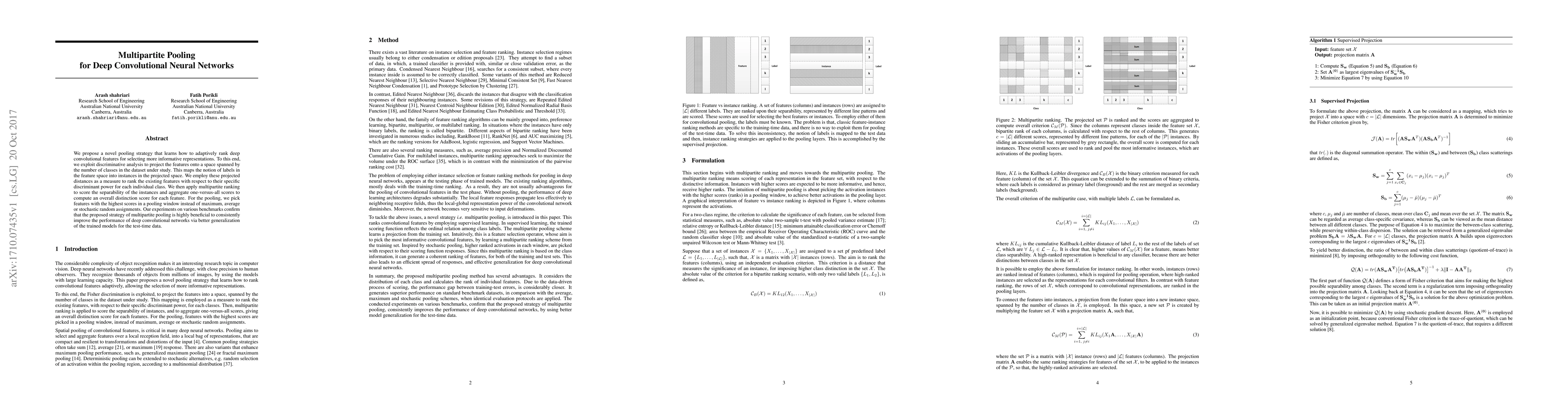 This paper introduces a novel adaptive pooling strategy for deep convolutional neural networks that ranks features based on their discriminative power for each class. The proposed multipartite pooling method selects features with the highest separability scores, leading to improved model performance and generalization on various benchmarks.