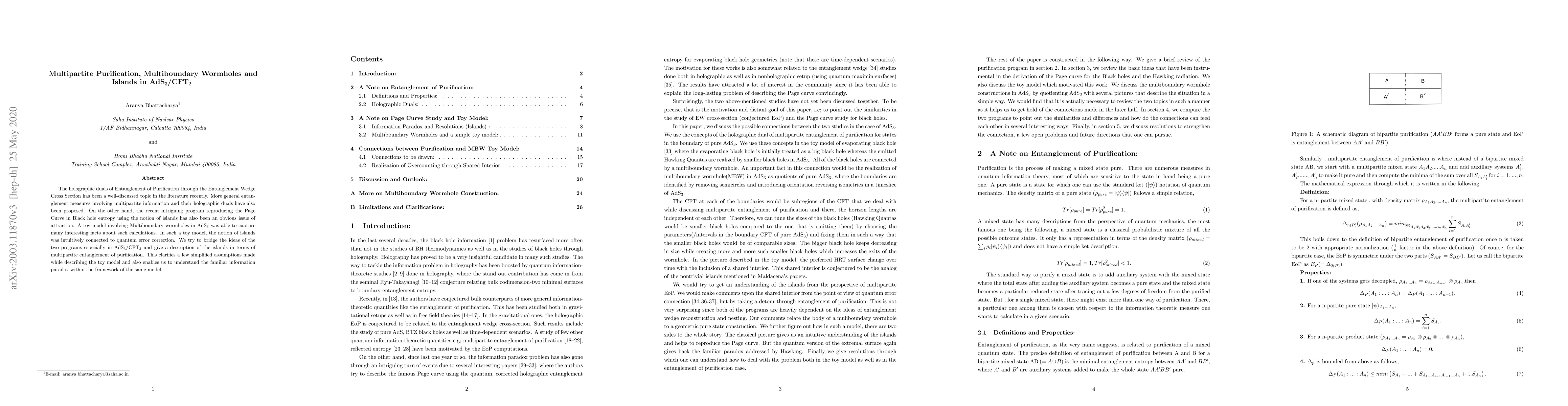 This paper explores the connection between multipartite purification in AdS$_{3}$/CFT$_{2}$ and the concept of islands in the context of black hole entropy, proposing a model that links multiboundary wormholes to quantum error correction and clarifying assumptions made in the toy model. It aims to resolve familiar information paradoxes within this framework.