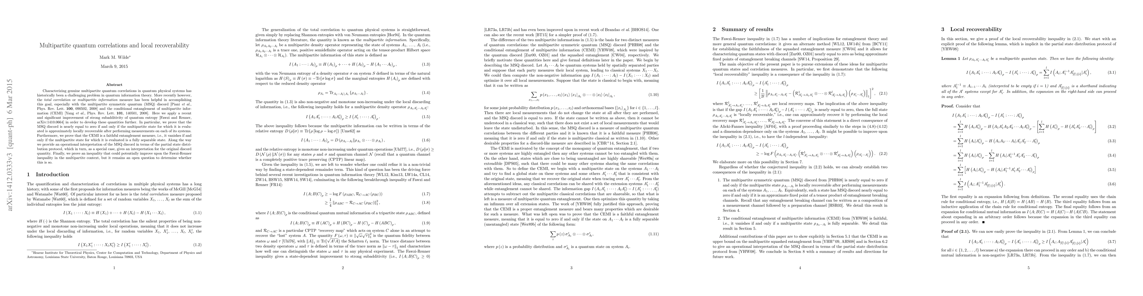 Characterizing genuine multipartite quantum correlations in quantum physical systems has historically been a challenging problem in quantum information theory. More recently however, the total correlation or multipartite information measure has been helpful in accomplishing this goal, especially with the multipartite symmetric quantum (MSQ) discord [Piani et al., Phys. Rev. Lett. 100, 090502, 2008] and the conditional entanglement of multipartite information (CEMI) [Yang et al., Phys. Rev. Lett. 101, 140501, 2008]. Here we apply a recent and significant improvement of strong subadditivity of quantum entropy [Fawzi and Renner, arXiv:1410.0664] in order to develop these quantities further. In particular, we prove that the MSQ discord is nearly equal to zero if and only if the multipartite state for which it is evaluated is approximately locally recoverable after performing measurements on each of its systems. Furthermore, we prove that the CEMI is a faithful entanglement measure, i.e., it vanishes if and only if the multipartite state for which it is evaluated is a fully separable state. Along the way we provide an operational interpretation of the MSQ discord in terms of the partial state distribution protocol, which in turn, as a special case, gives an interpretation for the original discord quantity. Finally, we prove an inequality that could potentially improve upon the Fawzi-Renner inequality in the multipartite context, but it remains an open question to determine whether this is so.