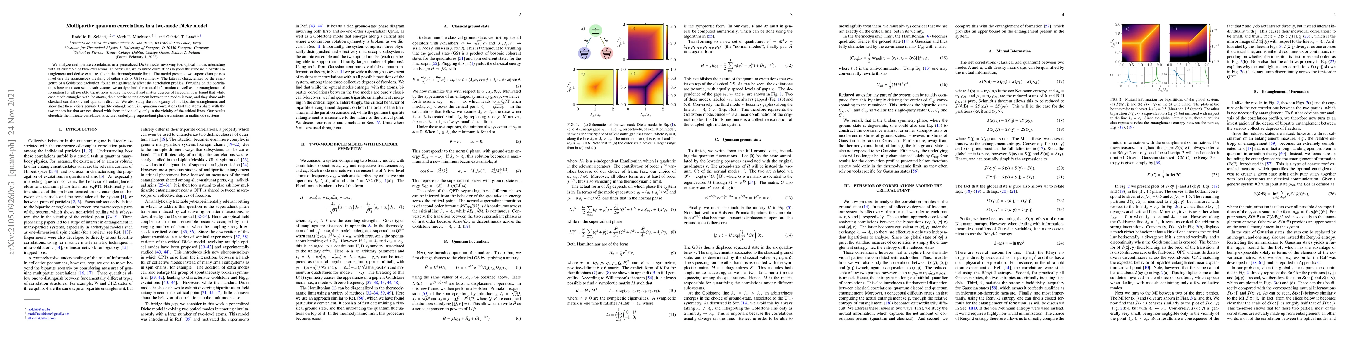 We analyze multipartite correlations in a generalized Dicke model involving two optical modes interacting with an ensemble of two-level atoms. In particular, we examine correlations beyond the standard bipartite entanglement and derive exact results in the thermodynamic limit. The model presents two superradiant phases involving the spontaneous breaking of either a $\mathbb{Z}_2$ or $\mathrm{U}(1)$ symmetry. The latter is characterized by the emergence of a Goldstone excitation, found to significantly affect the correlation profiles. Focusing on the correlations between macroscopic subsystems, we analyze both the mutual information as well as the entanglement of formation for all possible bipartitions among the optical and matter degrees of freedom. It is found that while each mode entangles with the atoms, the bipartite entanglement between the modes is zero, and they share only classical correlations and quantum discord. We also study the monogamy of multipartite entanglement and show that there exists genuine tripartite entanglement, i.e. quantum correlations that the atoms share with the two modes but that are not shared with them individually, only in the vicinity of the critical lines. Our results elucidate the intricate correlation structures underlying superradiant phase transitions in multimode systems.