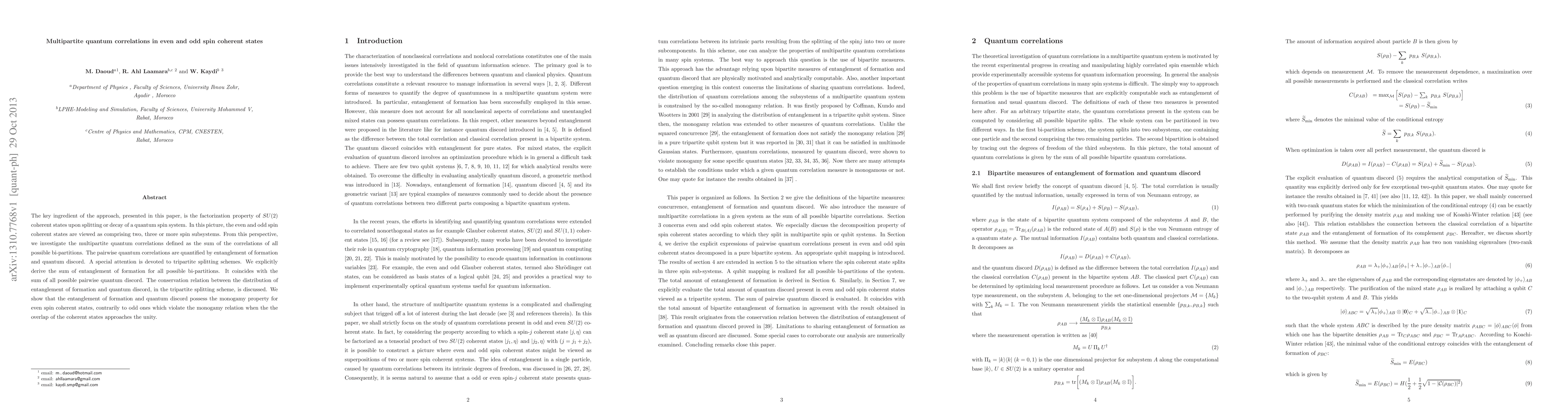 The key ingredient of the approach, presented in this paper, is the factorization property of $SU(2)$ coherent states upon splitting or decay of a quantum spin system. In this picture, the even and odd spin coherent states are viewed as comprising two, three or more spin subsystems. From this perspective, we investigate the multipartite quantum correlations defined as the sum of the correlations of all possible bi-partitions. The pairwise quantum correlations are quantified by entanglement of formation and quantum discord. A special attention is devoted to tripartite splitting schemes. We explicitly derive the sum of entanglement of formation for all possible bi-partitions. It coincides with the sum of all possible pairwise quantum discord. The conservation relation between the distribution of entanglement of formation and quantum discord, in the tripartite splitting scheme, is discussed. We show that the entanglement of formation and quantum discord possess the monogamy property for even spin coherent states, contrarily to odd ones which violate the monogamy relation when the the overlap of the coherent states approaches the unity.