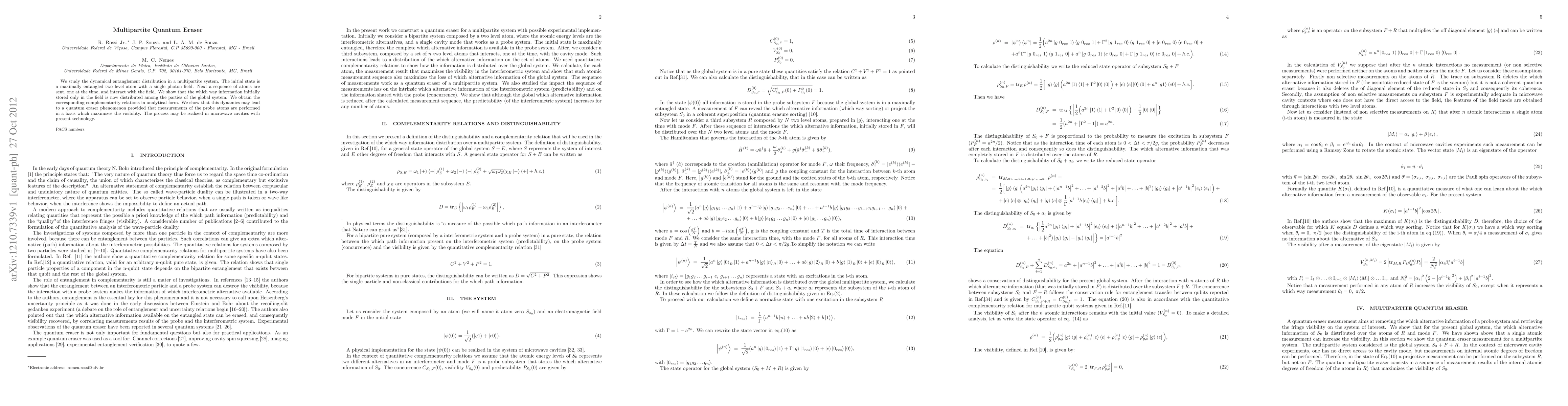 We study the dynamical entanglement distribution in a multipartite system. The initial state is a maximally entangled two level atom with a single photon field. Next a sequence of atoms are sent, one at the time, and interact with the field. We show that the which way information initially stored only in the field is now distributed among the parties of the global system. We obtain the corresponding complementarity relations in analytical form. We show that this dynamics may lead to a quantum eraser phenomenon provided that measurements of the probe atoms are performed in a basis which maximizes the visibility. The process may be realized in microwave cavities with present technology.