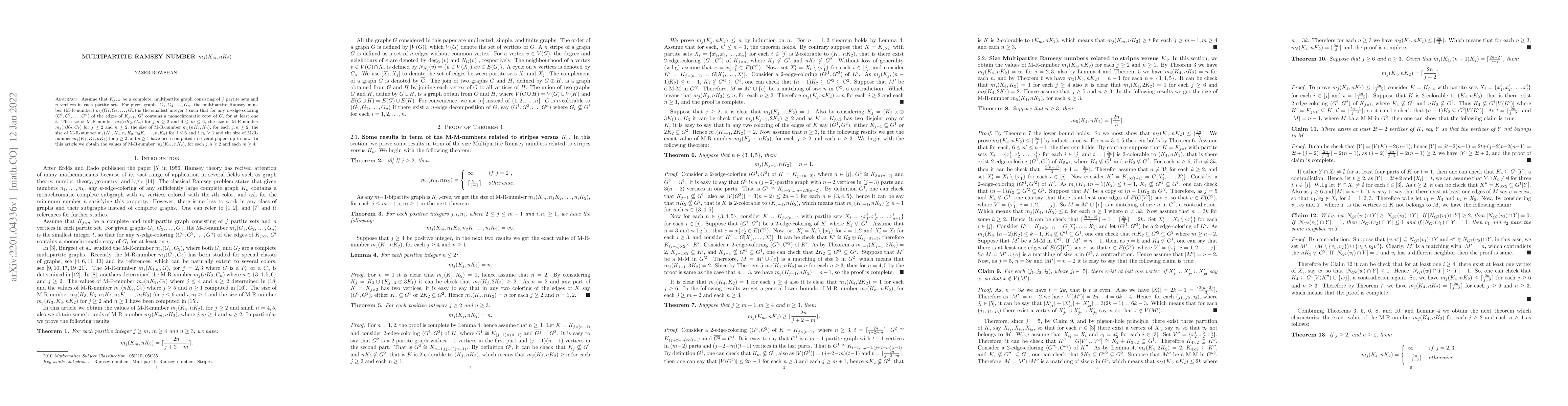 Assume that $K_{j\times n}$ be a complete, multipartite graph consisting of $j$ partite sets and $n$ vertices in each partite set. For given graphs $G_1, G_2,\ldots, G_n$, the multipartite Ramsey number (M-R-number) $m_j(G_1, G_2, \ldots,G_n)$ is the smallest integer $t$ such that for any $n$-edge-coloring $(G^1,G^2,\ldots, G^n)$ of the edges of $K_{j\times t}$, $G^i$ contains a monochromatic copy of $G_i$ for at least one $i$. The size of M-R-number $m_j(nK_2, C_m)$ for $j, n\geq 2$ and $4\leq m\leq 6$, the size of M-R-number $m_j(nK_2, C_7)$ for $j \geq 2$ and $n\geq 2$, the size of M-R-number $m_j(nK_2,K_3)$, for each $j,n\geq 2$, the size of M-R-number $m_j(K_3,K_3, n_1K_2,n_2K_,\ldots,n_iK_2)$ for $j \leq 6$ and $i,n_i\geq 1$ and the size of M-R-number $m_j(K_3,K_3, nK_2)$ for $j \geq 2$ and $n\geq 1$ have been computed in several papers up to now. In this article we obtain the values of M-R-number $m_j(K_m, nK_2)$, for each $j,n\geq 2$ and each $m\geq 4$.