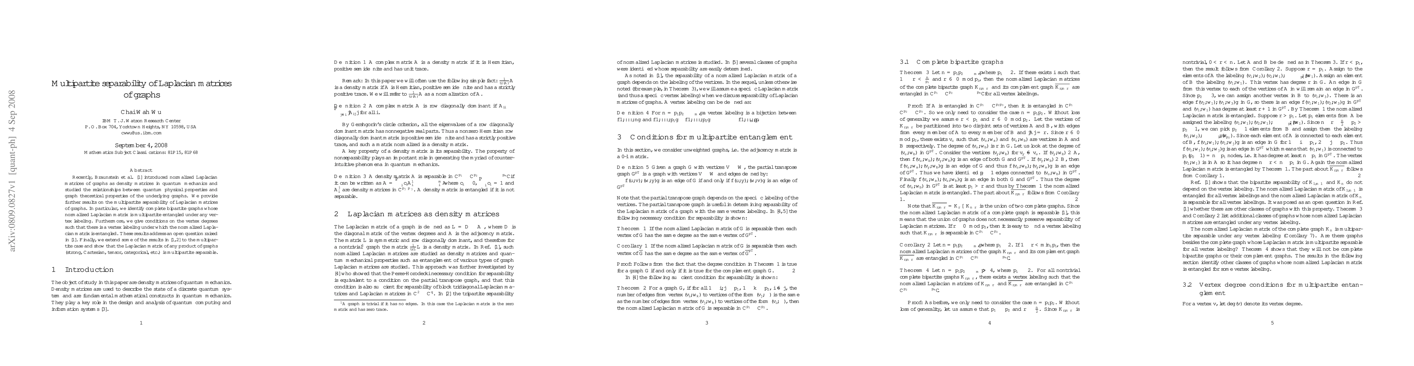 Recently, Braunstein et al. [1] introduced normalized Laplacian matrices of graphs as density matrices in quantum mechanics and studied the relationships between quantum physical properties and graph theoretical properties of the underlying graphs. We provide further results on the multipartite separability of Laplacian matrices of graphs. In particular, we identify complete bipartite graphs whose normalized Laplacian matrix is multipartite entangled under any vertex labeling. Furthermore, we give conditions on the vertex degrees such that there is a vertex labeling under which the normalized Laplacian matrix is entangled. These results address an open question raised in [1]. Finally, we extend some of the results in [1,2] to the multipartite case and show that the Laplacian matrix of any product of graphs (strong, Cartesian, tensor, categorical, etc.) is multipartite separable.