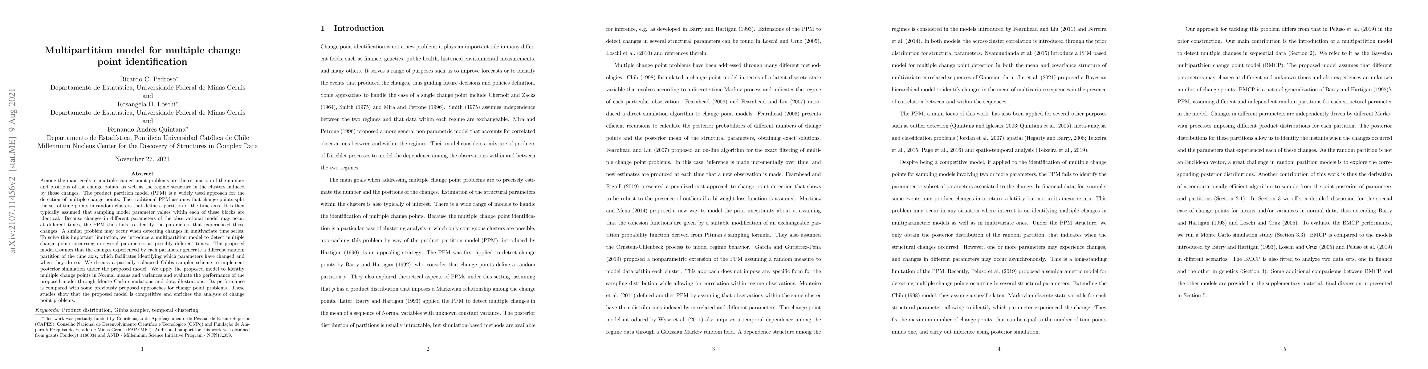 The paper introduces a multipartition model for identifying multiple change points in time series data, addressing limitations of the traditional partition model by allowing different parameters to change at different times. The proposed model uses a partially collapsed Gibbs sampler for posterior simulation and demonstrates competitive performance through Monte Carlo simulations and data illustrations.
