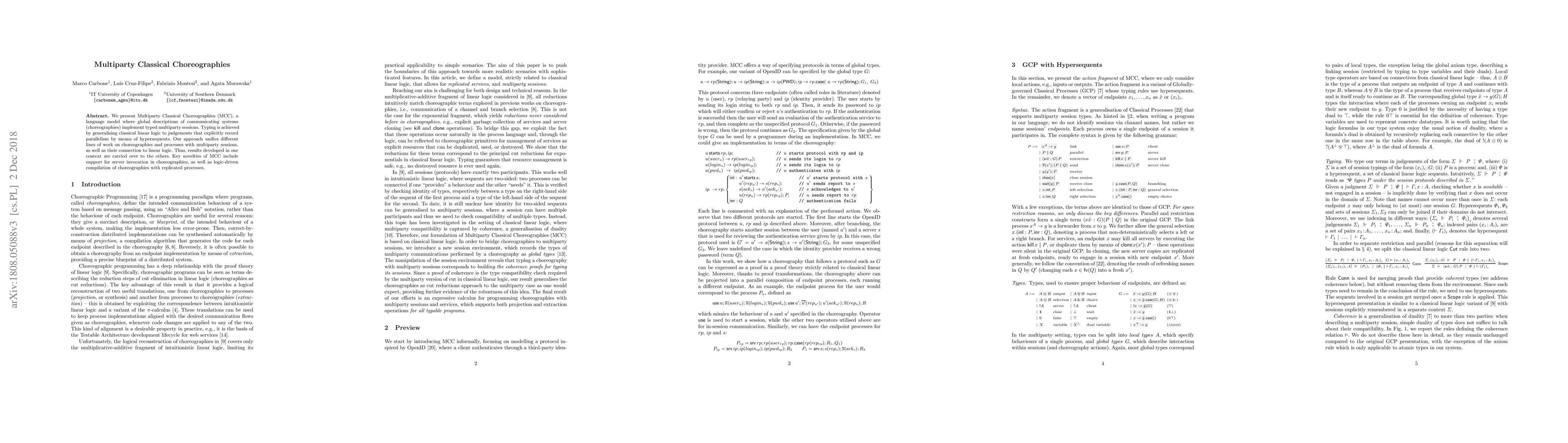 The research introduces Multiparty Classical Choreographies (MCC), a language model that unifies different lines of work on choreographies and multiparty sessions using classical linear logic with hypersequents for typing.