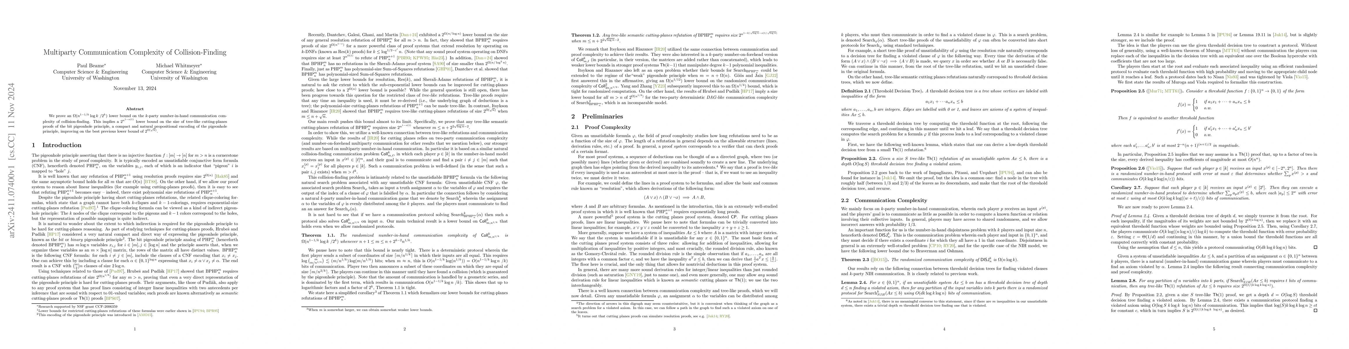 We prove an $\Omega(n^{1-1/k} \log k \ /2^k)$ lower bound on the $k$-party number-in-hand communication complexity of collision-finding. This implies a $2^{n^{1-o(1)}}$ lower bound on the size of tree-like cutting-planes proofs of the bit pigeonhole principle, a compact and natural propositional encoding of the pigeonhole principle, improving on the best previous lower bound of $2^{\Omega(\sqrt{n})}$.