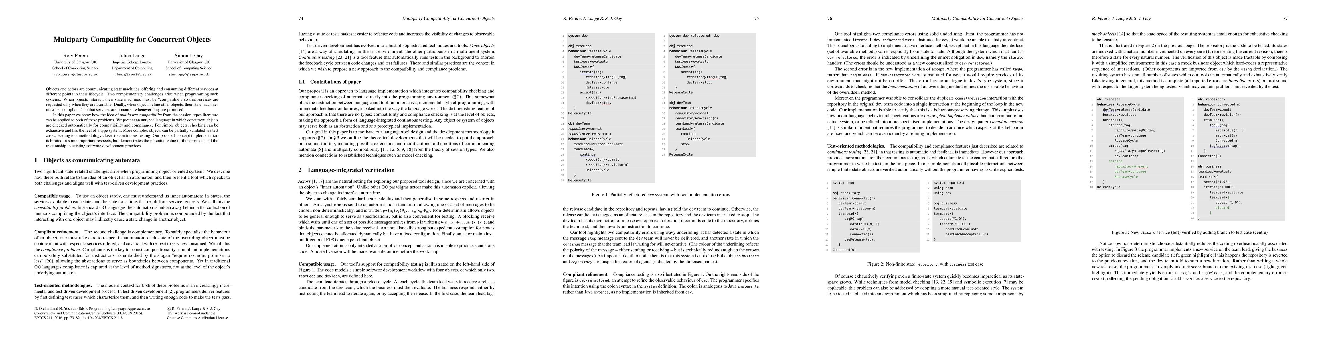 Objects and actors are communicating state machines, offering and consuming different services at different points in their lifecycle. Two complementary challenges arise when programming such systems. When objects interact, their state machines must be "compatible", so that services are requested only when they are available. Dually, when objects refine other objects, their state machines must be "compliant", so that services are honoured whenever they are promised. In this paper we show how the idea of multiparty compatibility from the session types literature can be applied to both of these problems. We present an untyped language in which concurrent objects are checked automatically for compatibility and compliance. For simple objects, checking can be exhaustive and has the feel of a type system. More complex objects can be partially validated via test cases, leading to a methodology closer to continuous testing. Our proof-of-concept implementation is limited in some important respects, but demonstrates the potential value of the approach and the relationship to existing software development practices.