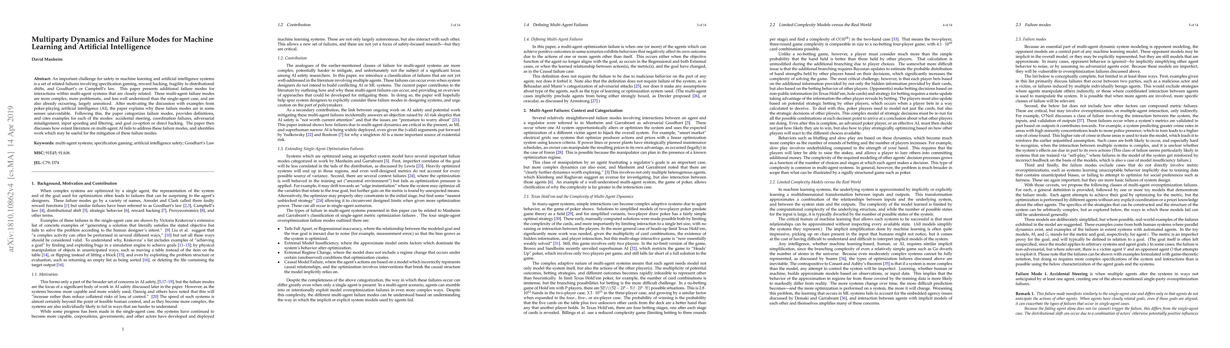 This paper identifies and categorizes complex failure modes in multi-agent machine learning systems, including accidental steering, coordination failures, and adversarial misalignment, which are more problematic than single-agent failures. It argues that these issues are largely unnoticed but unavoidable, and suggests potential mitigation strategies based on existing literature.