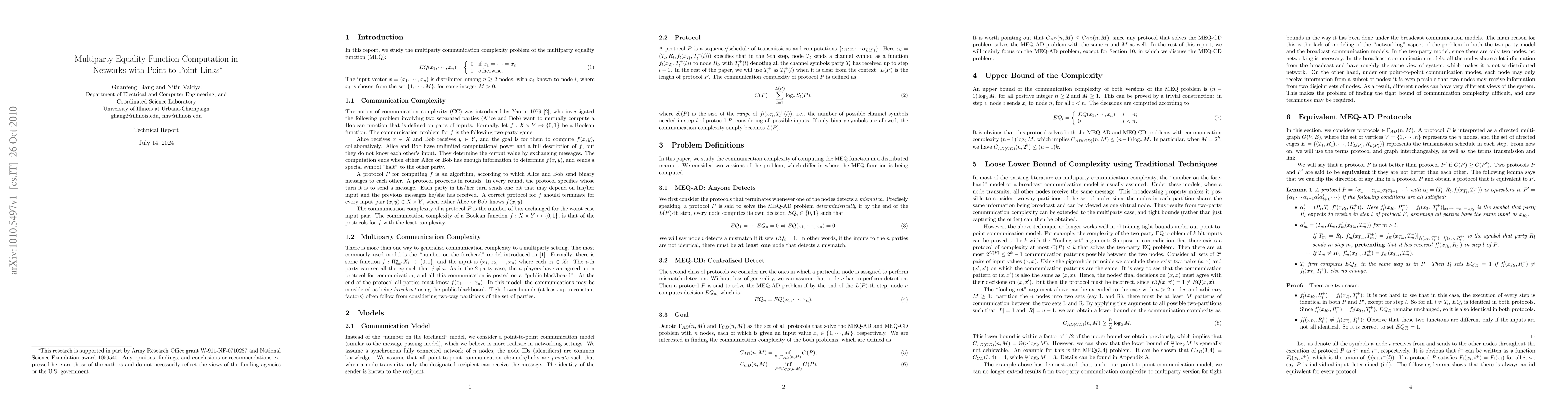 In this report, we study the multiparty communication complexity problem of the multiparty equality function (MEQ): EQ(x_1,...,x_n) = 1 if x_1=...=x_n, and 0 otherwise. The input vector (x_1,...,x_n) is distributed among n>=2 nodes, with x_i known to node i, where x_i is chosen from the set {1,...,M}, for some integer M>0. Instead of the "number on the forehand" model, we consider a point-to-point communication model (similar to the message passing model), which we believe is more realistic in networking settings. We assume a synchronous fully connected network of n nodes, the node IDs (identifiers) are common knowledge. We assume that all point-to-point communication channels/links are private such that when a node transmits, only the designated recipient can receive the message. The identity of the sender is known to the recipient. We demonstrate that traditional techniques generalized from two-party communication complexity problem are not sufficient to obtain tight bounds under the point-to-point communication model. We then introduce techniques which significantly reduce the space of protocols to study. These techniques are used to study some instances of the MEQ problem.