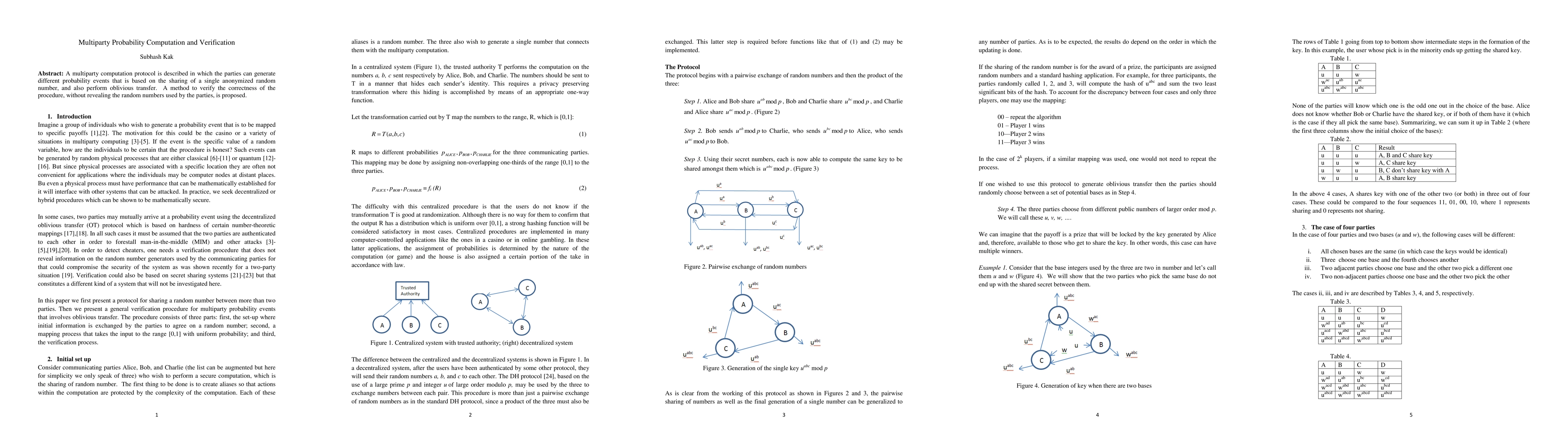 A multiparty computation protocol is described in which the parties can generate different probability events that is based on the sharing of a single anonymized random number, and also perform oblivious transfer. A method to verify the correctness of the procedure, without revealing the random numbers used by the parties, is proposed.