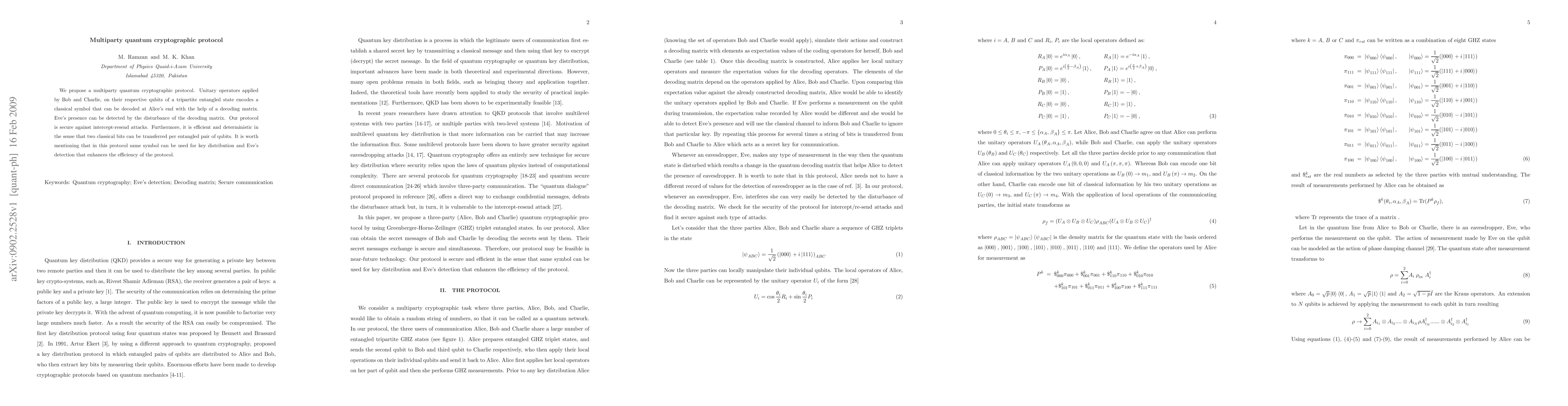 This research proposes a secure multiparty quantum cryptographic protocol where unitary operators used by participants encode classical symbols in entangled qubits, allowing efficient and deterministic key distribution while detecting eavesdroppers via disturbances in the decoding matrix. The protocol is resilient to intercept-resend attacks and uses the same symbol for both key and detection, enhancing efficiency.